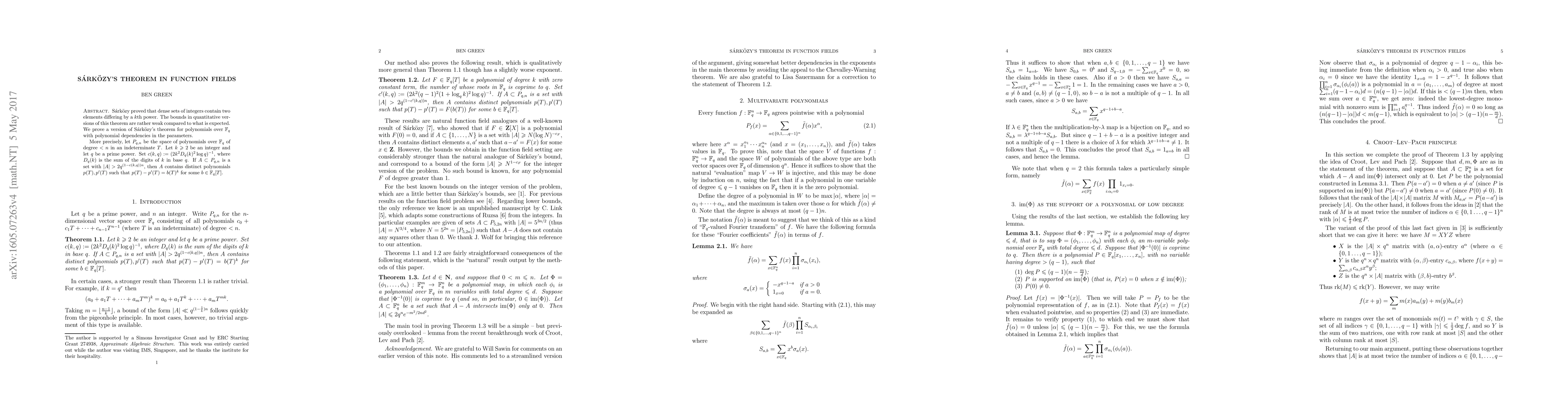 S\'ark\"ozy proved that dense sets of integers contain two elements differing by a $k$th power. The bounds in quantitative versions of this theorem are rather weak compared to what is expected. We prove a version of S\'ark\"ozy's theorem for polynomials over $\mathbb{F}_q$ with polynomial dependencies in the parameters. More precisely, let $P_{q,n}$ be the space of polynomials over $\mathbb{F}_q$ of degree $< n$ in an indeterminate $T$. Let $k \geq 2$ be an integer and let $q$ be a prime power. Set $c(k,q) := (2 k^2 D_q(k)^2\log q)^{-1}$, where $D_q(k)$ is the sum of the digits of $k$ in base $q$. If $A \subset P_{q,n}$ is a set with $|A| > 2q^{(1 - c(k,q))n}$, then $A$ contains distinct polynomials $p(T), p'(T)$ such that $p(T) - p'(T) = b(T)^k$ for some $b \in \mathbb{F}_q[T]$.
