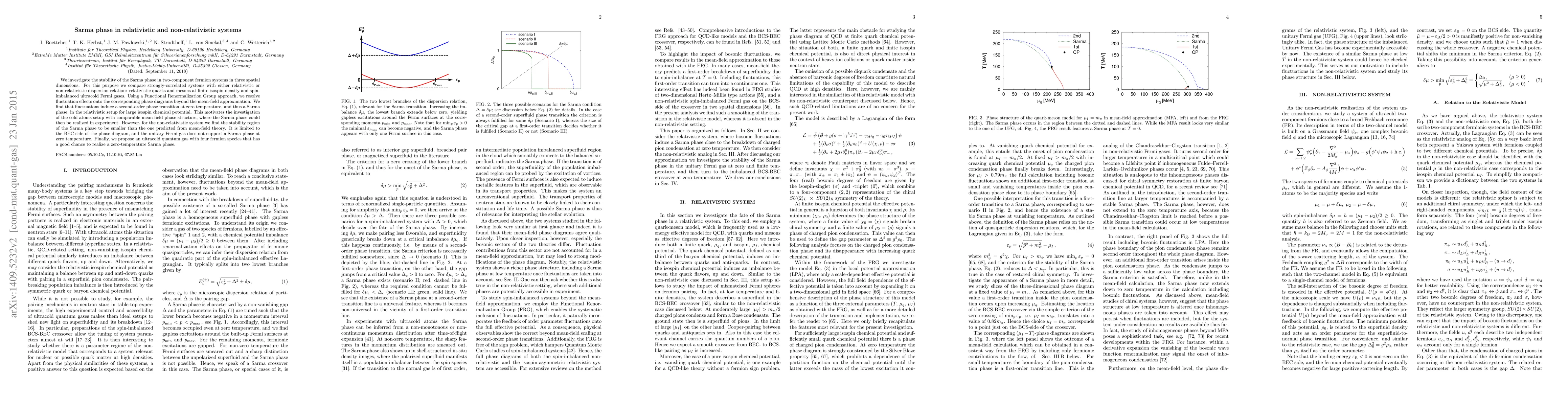 We investigate the stability of the Sarma phase in two-component fermion systems in three spatial dimensions. For this purpose we compare strongly-correlated systems with either relativistic or non-relativistic dispersion relation: relativistic quarks and mesons at finite isospin density and spin-imbalanced ultracold Fermi gases. Using a Functional Renormalization Group approach, we resolve fluctuation effects onto the corresponding phase diagrams beyond the mean-field approximation. We find that fluctuations induce a second order phase transition at zero temperature, and thus a Sarma phase, in the relativistic setup for large isospin chemical potential. This motivates the investigation of the cold atoms setup with comparable mean-field phase structure, where the Sarma phase could then be realized in experiment. However, for the non-relativistic system we find the stability region of the Sarma phase to be smaller than the one predicted from mean-field theory. It is limited to the BEC side of the phase diagram, and the unitary Fermi gas does not support a Sarma phase at zero temperature. Finally, we propose an ultracold quantum gas with four fermion species that has a good chance to realize a zero-temperature Sarma phase.