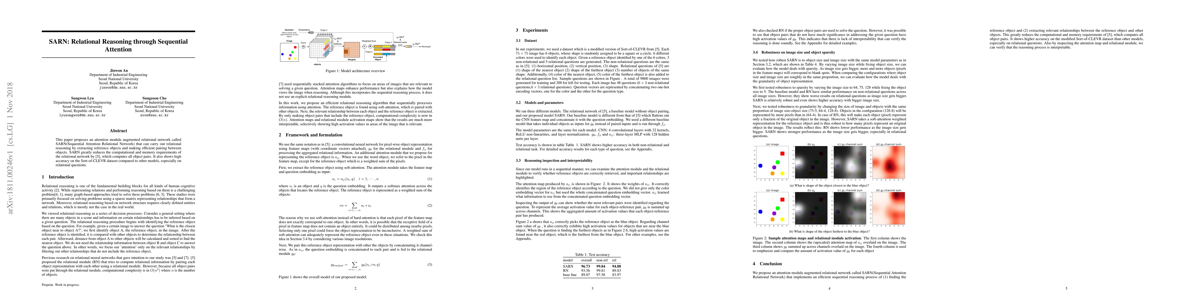SARN, a Sequential Attention Relational Network, enhances relational reasoning through a specialized attention module that pairs objects efficiently, significantly reducing computational and memory load while maintaining high accuracy on the Sort-of-CLEVR dataset, particularly for relational questions.