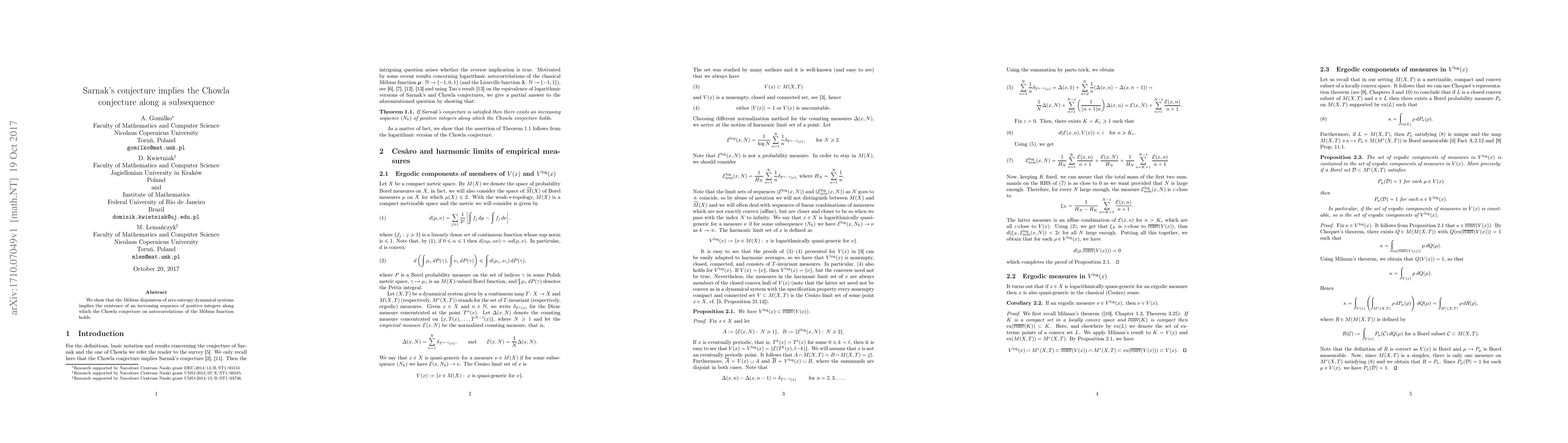 Summary: Sarnak's conjecture on Möbius disjointness in zero entropy systems implies the Chowla conjecture for the Möbius function's autocorrelations along a specific subsequence of integers. This establishes a significant connection between dynamical systems and number theory.
