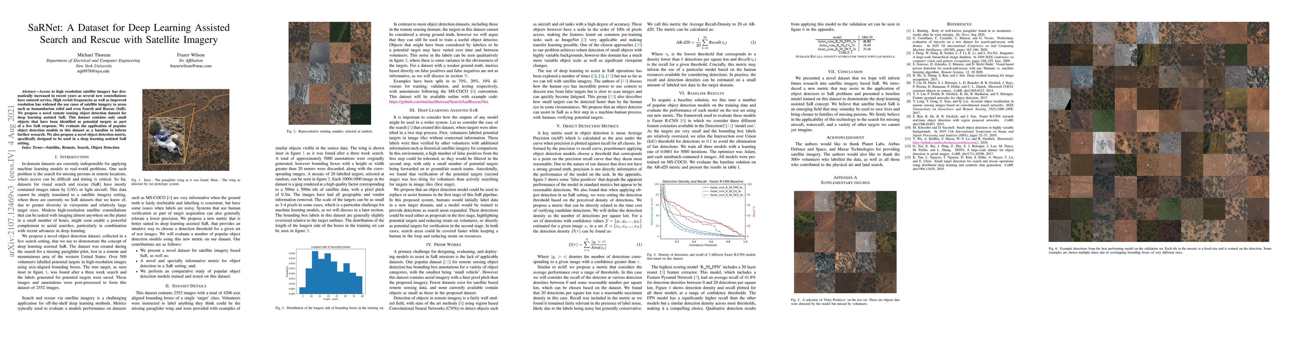 SaRNet is a new remote sensing dataset for deep learning assisted Search and Rescue, focusing on small objects identified in satellite imagery. The paper evaluates popular object detection models on this dataset and introduces a specialized detection metric for SaR applications.
