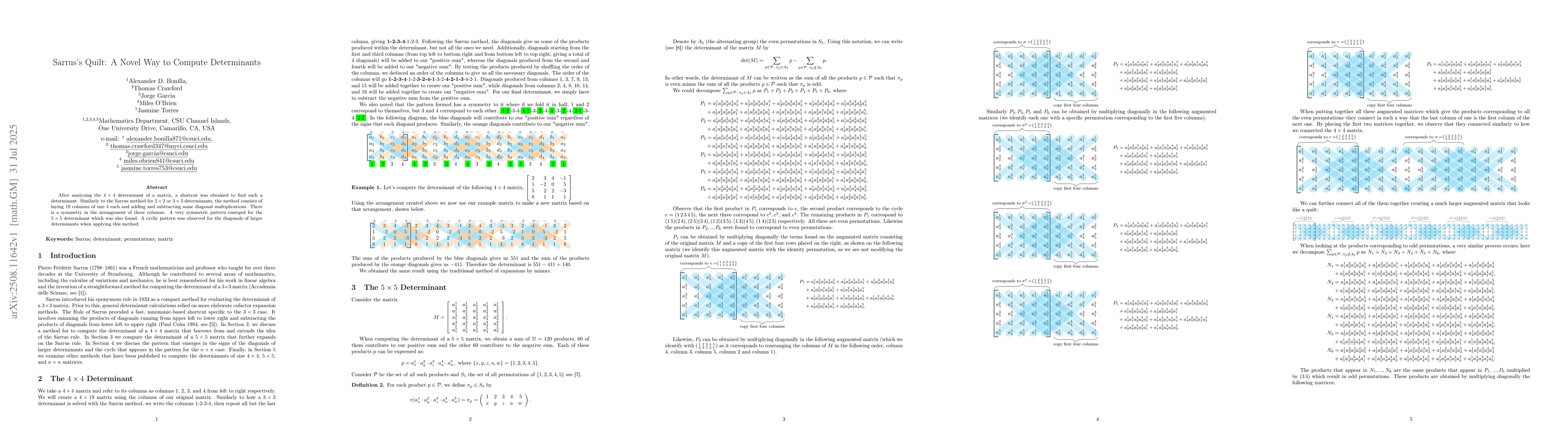 After analyzing the 4x4 determinant of a matrix, a shortcut was obtained to find such a determinant. Similarly to the Sarrus method for 2x2 or 3x3 determinants, the method consists of laying 19 columns of size 4 each and adding and subtracting some diagonal multiplications. There is a symmetry in the arrangement of these columns. A very symmetric pattern emerged for the 5x5 determinant which was also found. A cyclic pattern was observed for the diagonals of larger determinants when applying this method.
