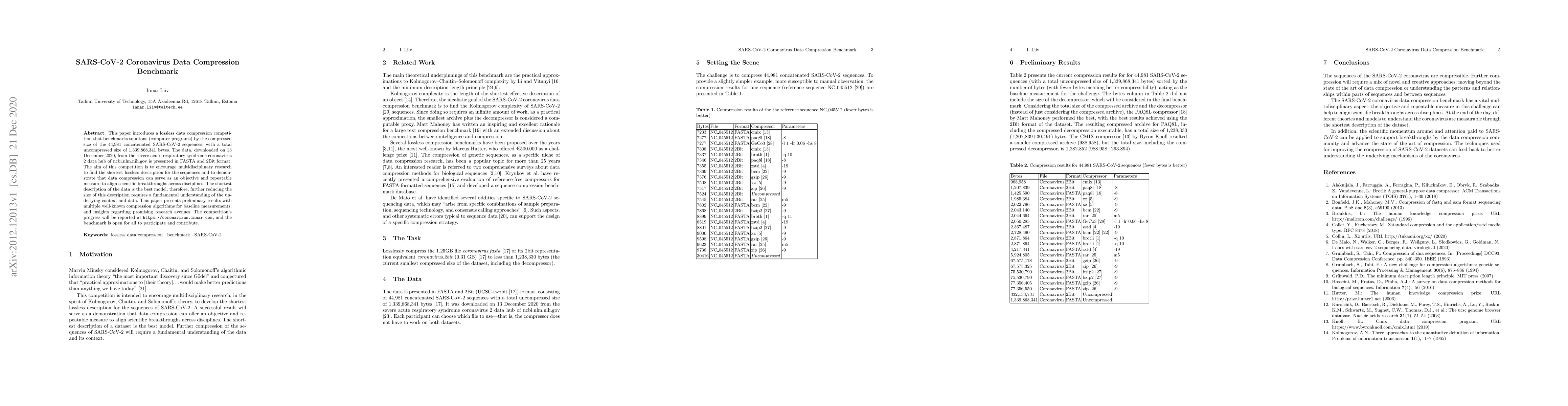 This paper introduces a lossless data compression competition that benchmarks solutions (computer programs) by the compressed size of the 44,981 concatenated SARS-CoV-2 sequences, with a total uncompressed size of 1,339,868,341 bytes. The data, downloaded on 13 December 2020, from the severe acute respiratory syndrome coronavirus 2 data hub of ncbi.nlm.nih.gov is presented in FASTA and 2Bit format. The aim of this competition is to encourage multidisciplinary research to find the shortest lossless description for the sequences and to demonstrate that data compression can serve as an objective and repeatable measure to align scientific breakthroughs across disciplines. The shortest description of the data is the best model; therefore, further reducing the size of this description requires a fundamental understanding of the underlying context and data. This paper presents preliminary results with multiple well-known compression algorithms for baseline measurements, and insights regarding promising research avenues. The competition's progress will be reported at \url{https://coronavirus.innar.com}, and the benchmark is open for all to participate and contribute.