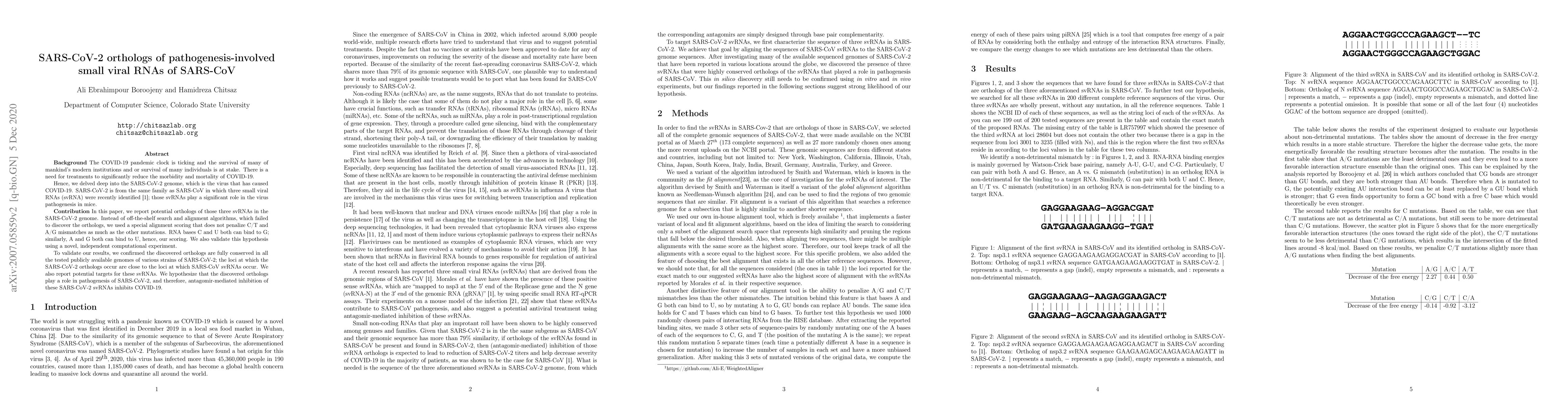 Background: The COVID-19 pandemic clock is ticking and the survival of many of mankind's modern institutions and or survival of many individuals is at stake. There is a need for treatments to significantly reduce the morbidity and mortality of COVID-19. Hence, we delved deep into the SARS-CoV-2 genome, which is the virus that has caused COVID-19. SARS-CoV-2 is from the same family as SARS-CoV in which three small viral RNAs (svRNA) were recently identified; those svRNAs play a significant role in the virus pathogenesis in mice. Contribution: In this paper, we report potential orthologs of those three svRNAs in the SARS-CoV-2 genome. Instead of off-the-shelf search and alignment algorithms, which failed to discover the orthologs, we used a special alignment scoring that does not penalize C/T and A/G mismatches as much as the other mutations. RNA bases C and U both can bind to G; similarly, A and G both can bind to U, hence, our scoring. We also validate this hypothesis using a novel, independent computational experiment. To validate our results, we confirmed the discovered orthologs are fully conserved in all the tested publicly available genomes of various strains of SARS-CoV-2; the loci at which the SARS-CoV-2 orthologs occur are close to the loci at which SARS-CoV svRNAs occur. We also report potential targets for these svRNAs. We hypothesize that the discovered orthologs play a role in pathogenesis of SARS-CoV-2, and therefore, antagomir-mediated inhibition of these SARS-CoV-2 svRNAs inhibits COVID-19.