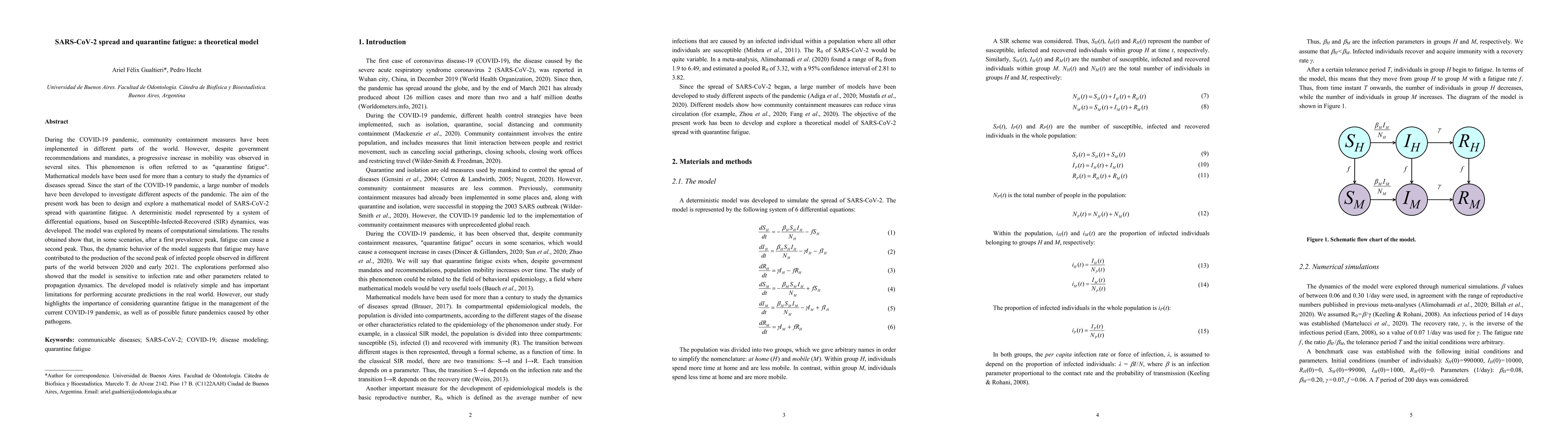 During the COVID-19 pandemic, community containment measures have been implemented in different parts of the world. However, despite government recommendations and mandates, a progressive increase in mobility was observed in several sites. This phenomenon is often referred to as "quarantine fatigue". Mathematical models have been used for more than a century to study the dynamics of diseases spread. Since the start of the COVID-19 pandemic, a large number of models have been developed to investigate different aspects of the pandemic. The aim of the present work has been to design and explore a mathematical model of SARS-CoV-2 spread with quarantine fatigue. A deterministic model represented by a system of differential equations, based on Susceptible-Infected-Recovered (SIR) dynamics, was developed. The model was explored by means of computational simulations. The results obtained show that, in some scenarios, after a first prevalence peak, fatigue can cause a second peak. Thus, the dynamic behavior of the model suggests that fatigue may have contributed to the production of the second peak of infected people observed in different parts of the world between 2020 and early 2021. The explorations performed also showed that the model is sensitive to infection rate and other parameters related to propagation dynamics. The developed model is relatively simple and has important limitations for performing accurate predictions in the real world. However, our study highlights the importance of considering quarantine fatigue in the management of the current COVID-19 pandemic, as well as of possible future pandemics caused by other pathogens.