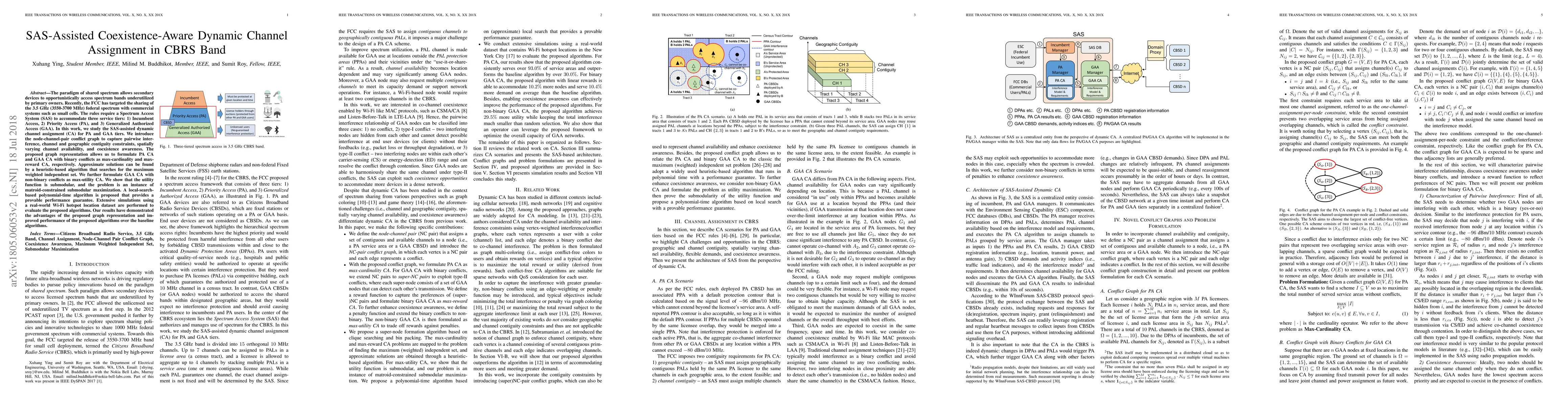 The paradigm of shared spectrum allows secondary devices to opportunistically access spectrum bands underutilized by primary owners. Recently, the FCC has targeted the sharing of the 3.5 GHz (3550-3700 MHz) federal spectrum with commercial systems such as small cells. The rules require a Spectrum Access System (SAS) to accommodate three service tiers: 1) Incumbent Access, 2) Priority Access (PA), and 3) Generalized Authorized Access (GAA). In this work, we study the SAS-assisted dynamic channel assignment (CA) for PA and GAA tiers.We introduce the node-channel-pair conflict graph to capture pairwise interference, channel and geographic contiguity constraints, spatially varying channel availability, and coexistence awareness. The proposed conflict graph allows us to formulate PA CA and GAA CA with binary conflicts as max-cardinality and max-reward CA, respectively. Approximate solutions can be found by a heuristic-based algorithm that search for the maximum weighted independent set. We further formulate GAA CA with non-binary conflicts as max-utility CA. We show that the utility function is submodular, and the problem is an instance of matroid-constrained submodular maximization. A polynomial-time algorithm based on local search is proposed that provides a provable performance guarantee. Extensive simulations using a real-world Wi-Fi hotspot location dataset are conducted to evaluate the proposed algorithms. Our results have demonstrated the advantages of the proposed graph representation and improved performance of the proposed algorithms over the baseline algorithms.