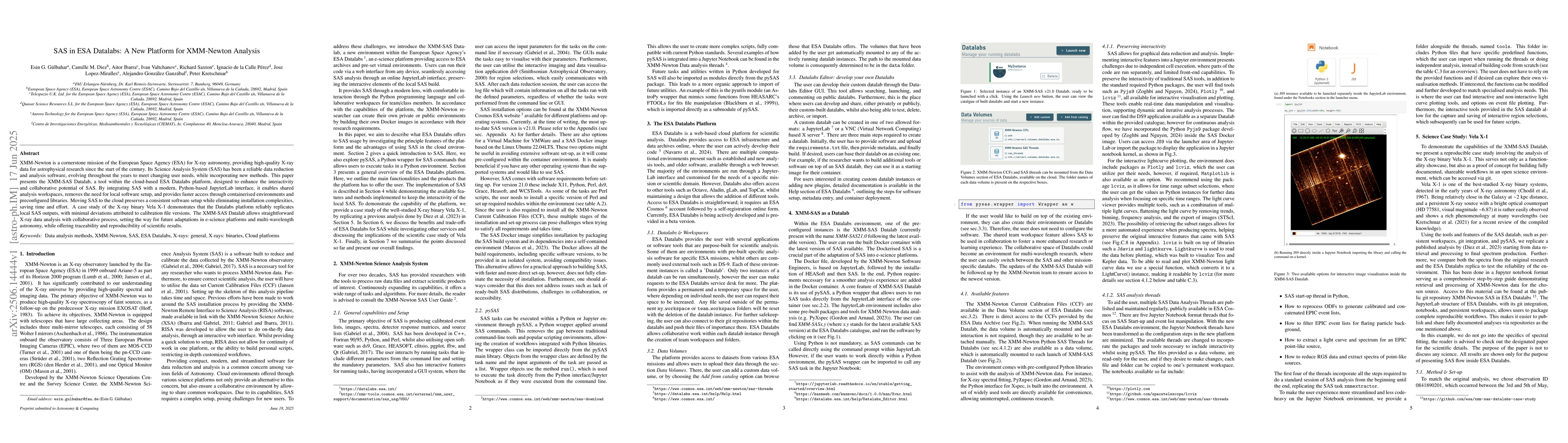 XMM-Newton is a cornerstone mission of the European Space Agency (ESA) for X-ray astronomy, providing high-quality X-ray data for astrophysical research since the start of the century. Its Science Analysis System (SAS) has been a reliable data reduction and analysis software, evolving throughout the years to meet changing user needs, while incorporating new methods. This paper presents the XMM-SAS Datalab, a tool within the cloud-based ESA Datalabs platform, designed to enhance the interactivity and collaborative potential of SAS. By integrating SAS with a modern, Python-based JupyterLab interface, it enables shared analysis workspaces, removes the need for local software setup, and provides faster access through containerised environments and preconfigured libraries. Moving SAS to the cloud preserves a consistent software setup while eliminating installation complexities, saving time and effort. A case study of the X-ray binary Vela X-1 demonstrates that the Datalabs platform reliably replicates local SAS outputs, with minimal deviations attributed to calibration file versions. The XMM-SAS Datalab allows straightforward X-ray data analysis with collaborative process, setting the way for future adaptations in e-science platforms and multi-wavelength astronomy, while offering traceability and reproducibility of scientific results.