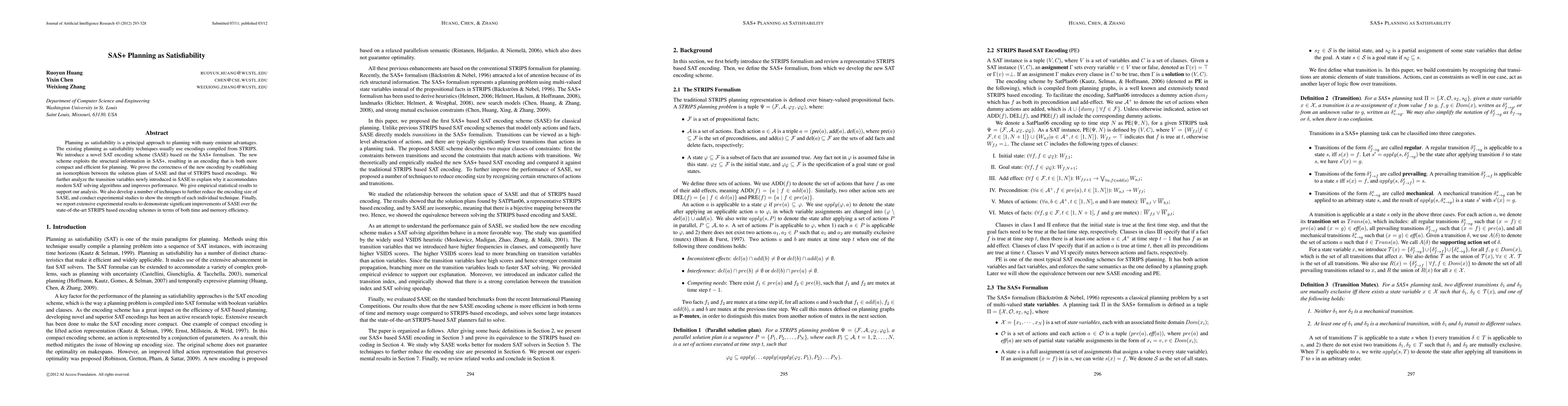 Researchers introduce a new SAT encoding scheme (SASE) based on SAS+ formalism that improves planning with satisfiability techniques, achieving significant time and memory efficiency gains over existing state-of-the-art schemes.