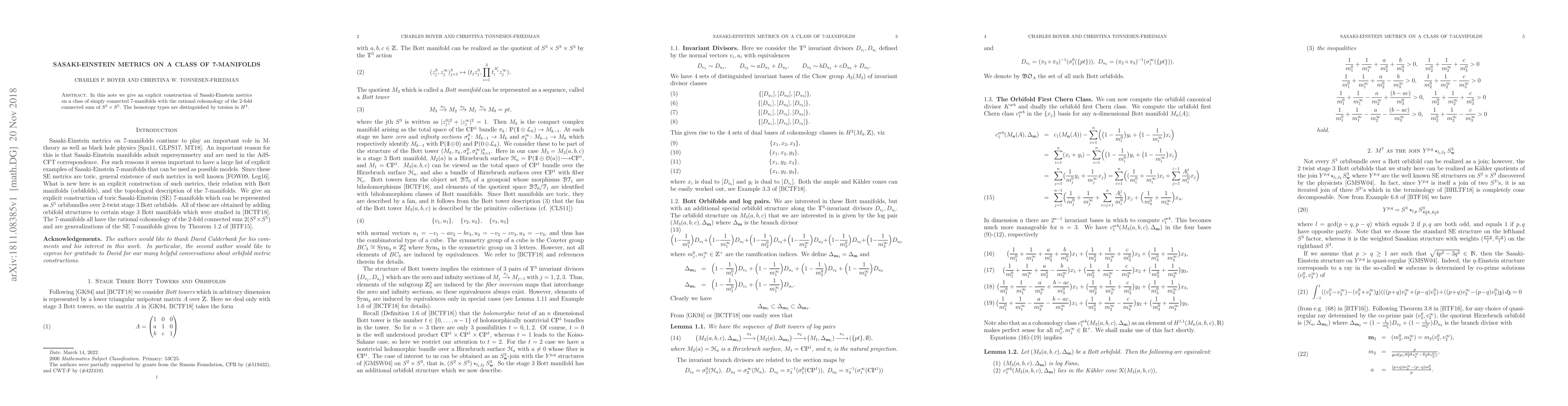 In this note we give an explicit construction of Sasaki-Einstein metrics on a class of simply connected 7-manifolds with the rational cohomology of the 2-fold connected sum of $S^2\times S^5$. The homotopy types are distinguished by torsion in $H^4$.