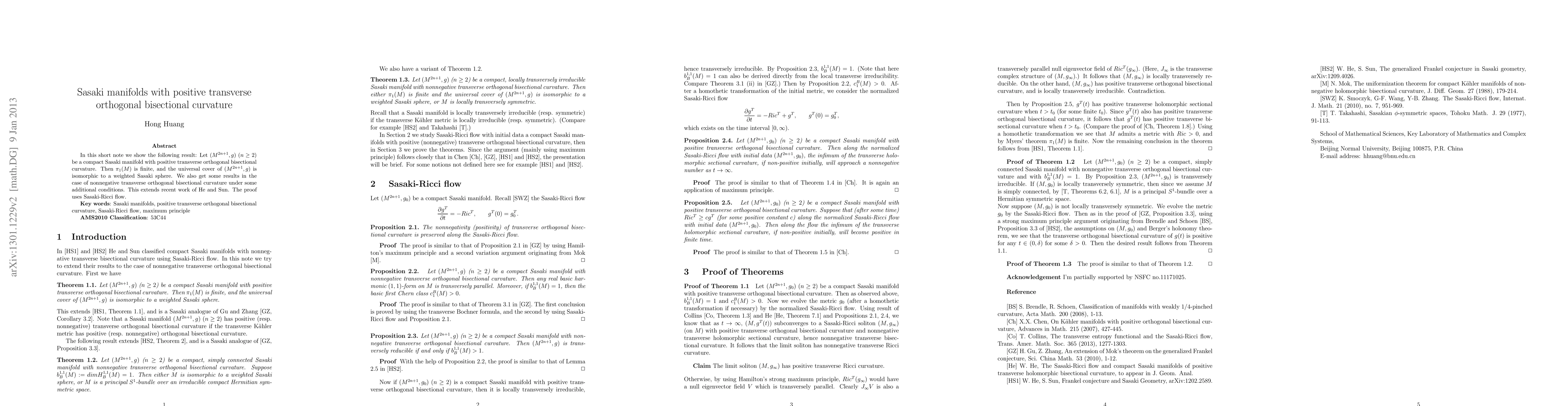 In this short note we show the following result: Let $(M^{2n+1},g)$ ($n \geq 2$) be a compact Sasaki manifold with positive transverse orthogonal bisectional curvature. Then $\pi_1(M)$ is finite, and the universal cover of $(M^{2n+1},g)$ is isomorphic to a weighted Sasaki sphere. We also get some results in the case of nonnegative transverse orthogonal bisectional curvature under some additional conditions. This extends recent work of He and Sun. The proof uses Sasaki-Ricci flow.