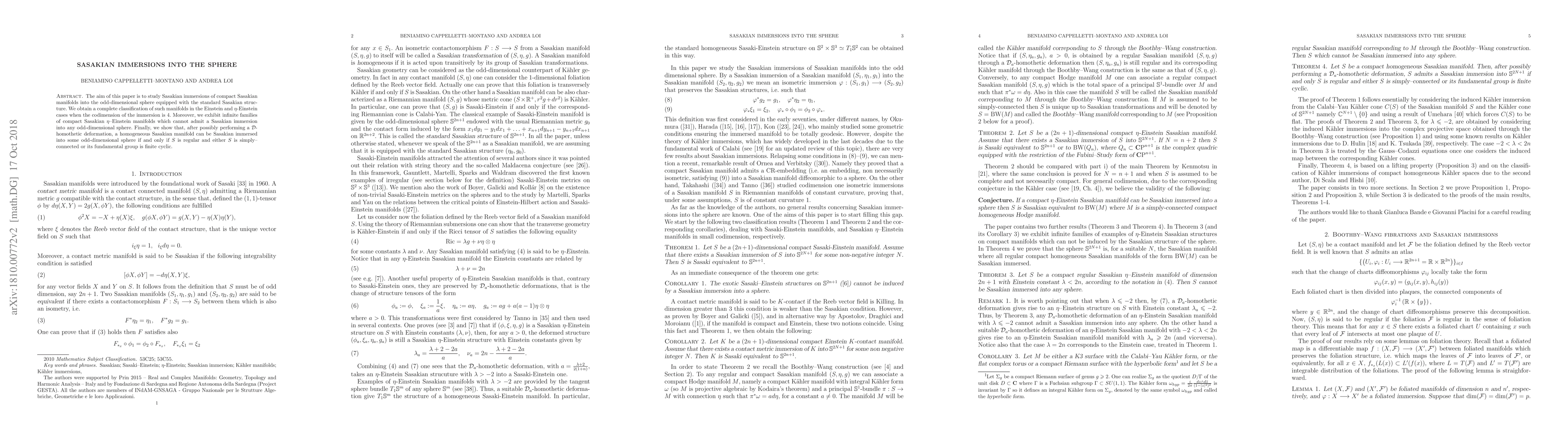 This paper classifies Sasakian immersions of compact Sasakian manifolds into odd-dimensional spheres, focusing on Einstein and $\eta$-Einstein cases in codimension 4. It also reveals infinite families of $\eta$-Einstein manifolds that do not admit such immersions, and concludes that homogeneous Sasakian manifolds can be immersed under specific conditions on their regularity and fundamental group structure.