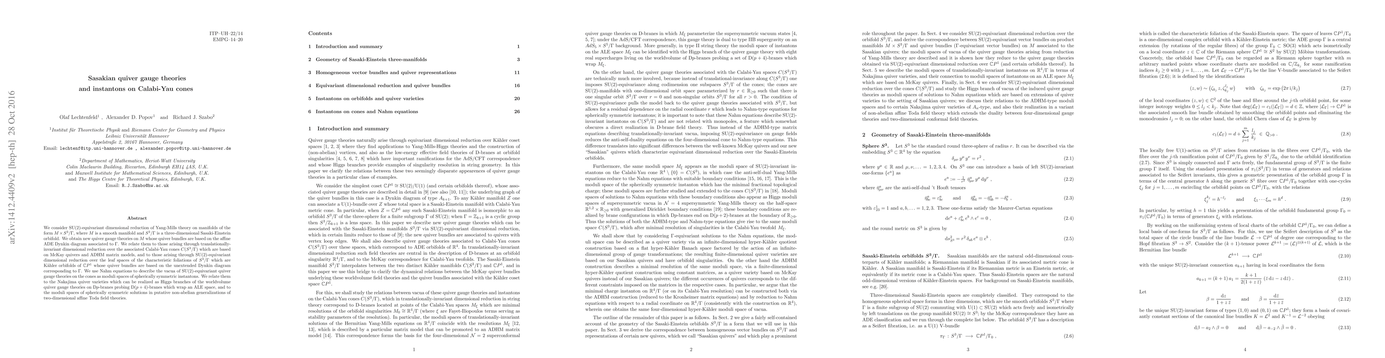 This paper investigates SU(2)-equivariant reductions of Yang-Mills theories on Sasakian-Einstein orbifolds, deriving new quiver gauge theories on smooth manifolds based on affine ADE Dynkin diagrams. It connects these theories to Calabi-Yau cones and relates them to moduli spaces of spherically symmetric instantons using Nahm equations.