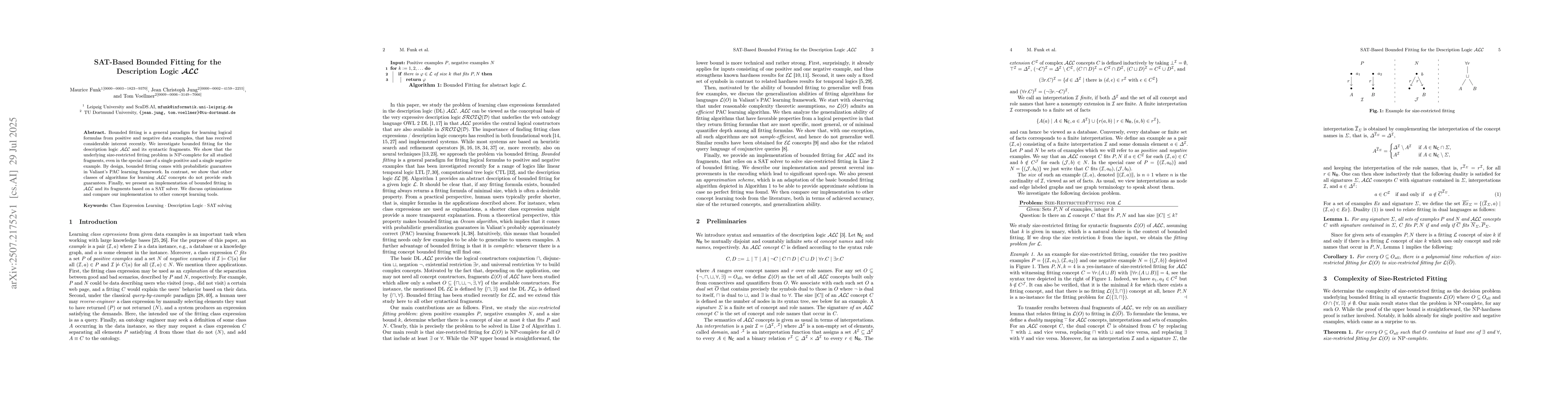 The paper investigates bounded fitting for the Description Logic ALC and its syntactic fragments using a SAT solver, demonstrating NP-completeness for size-restricted fitting problems even with single positive and negative examples.