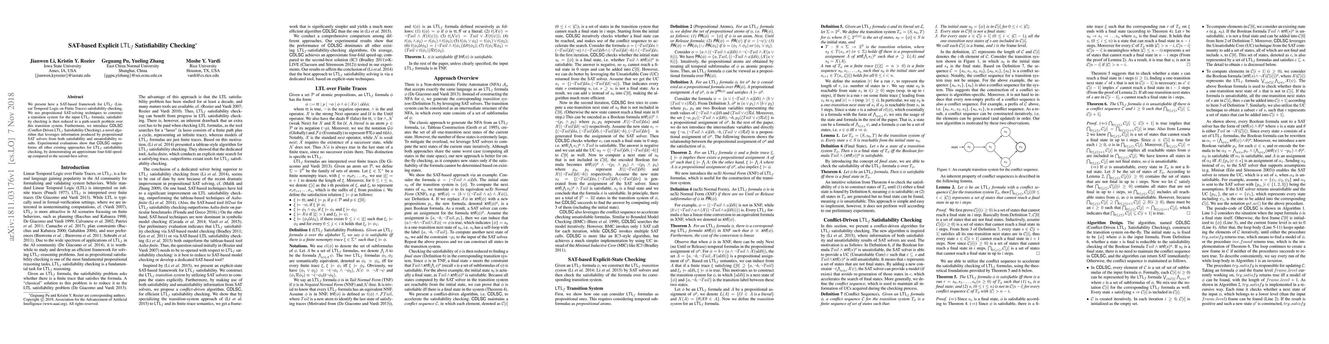 This paper introduces a SAT-based framework for checking LTLf satisfiability using propositional SAT-solving techniques, and proposes CDLSC, an algorithm that leverages SAT solver insights for faster and more efficient LTLf satisfiability checking, outperforming existing methods by approximately four times.