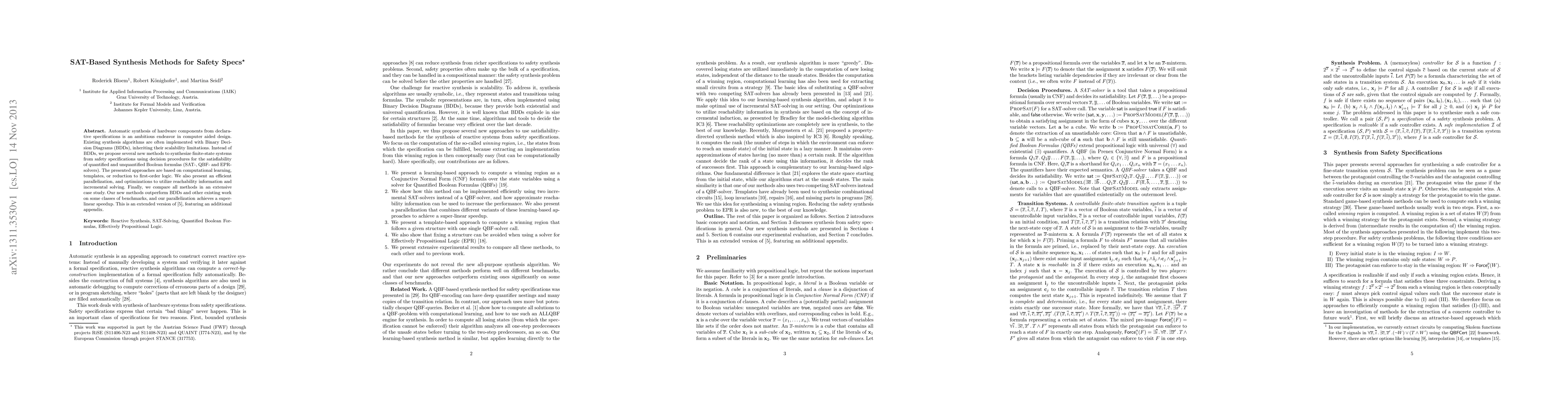 The paper proposes new SAT-based synthesis methods for hardware components from safety specifications, replacing traditional BDD-based algorithms. These methods leverage SAT, QBF, and EPR solvers, computational learning, templates, and first-order logic reduction, alongside parallelization and optimizations. Experimental results show superior performance over BDDs and existing methods, with notable speedups from parallelization.