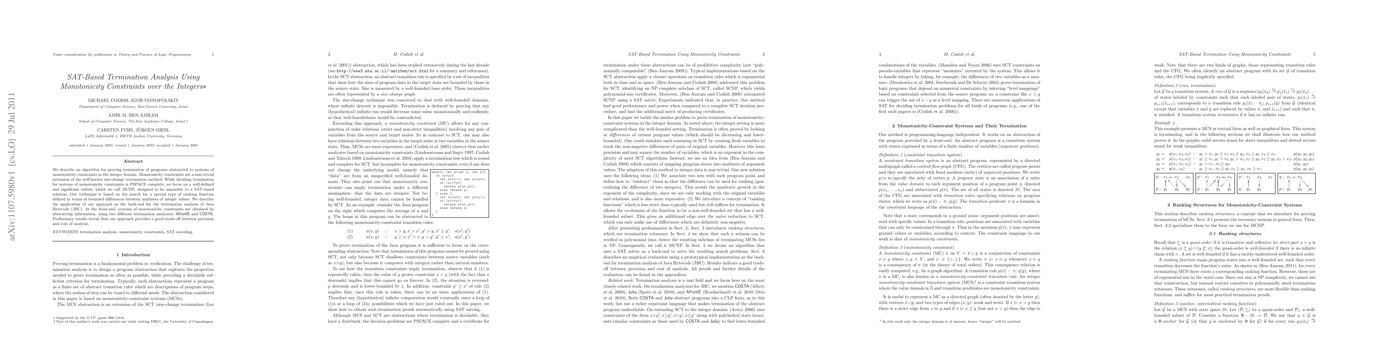 This paper presents an algorithm for proving termination of programs by abstracting them into systems of monotonicity constraints over integers, employing SAT-based techniques to solve the MCNP subset. The method uses a special ranking function based on bounded differences between multisets, and is applied to analyze Java Bytecode termination with AProVE and COSTA.