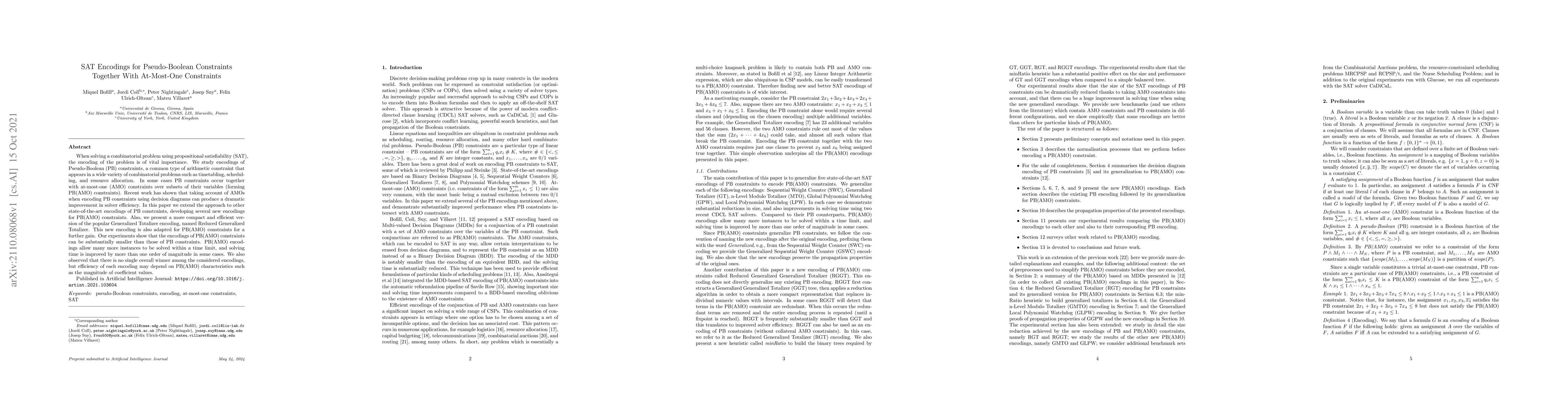 This paper develops new encodings for Pseudo-Boolean constraints combined with at-most-one constraints, showing substantial reductions in encoding size and significant improvements in solver efficiency, though no single encoding universally outperforms others depending on specific problem characteristics.