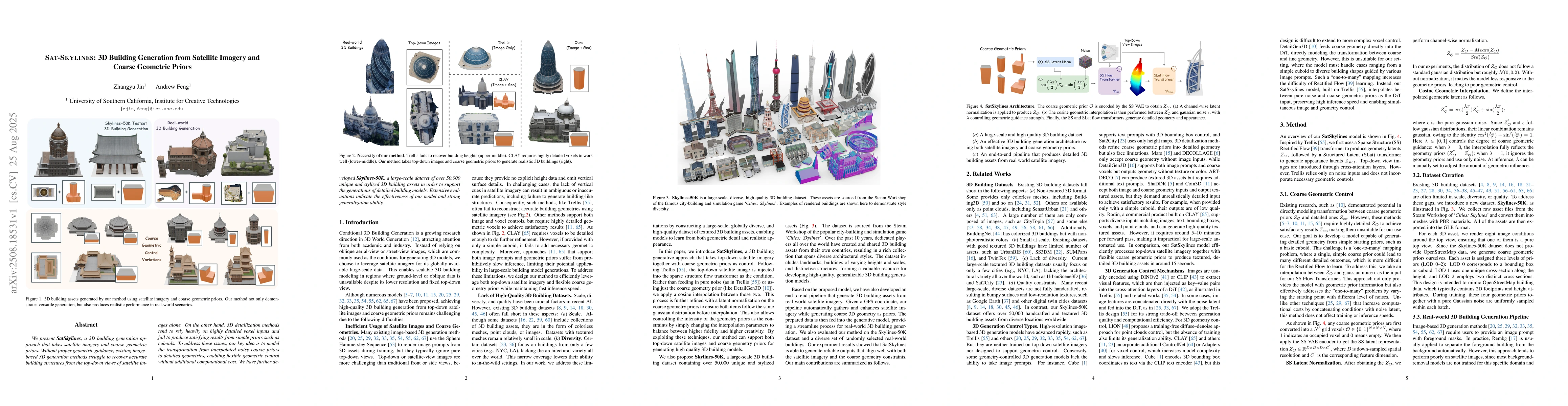 We present SatSkylines, a 3D building generation approach that takes satellite imagery and coarse geometric priors. Without proper geometric guidance, existing image-based 3D generation methods struggle to recover accurate building structures from the top-down views of satellite images alone. On the other hand, 3D detailization methods tend to rely heavily on highly detailed voxel inputs and fail to produce satisfying results from simple priors such as cuboids. To address these issues, our key idea is to model the transformation from interpolated noisy coarse priors to detailed geometries, enabling flexible geometric control without additional computational cost. We have further developed Skylines-50K, a large-scale dataset of over 50,000 unique and stylized 3D building assets in order to support the generations of detailed building models. Extensive evaluations indicate the effectiveness of our model and strong generalization ability.