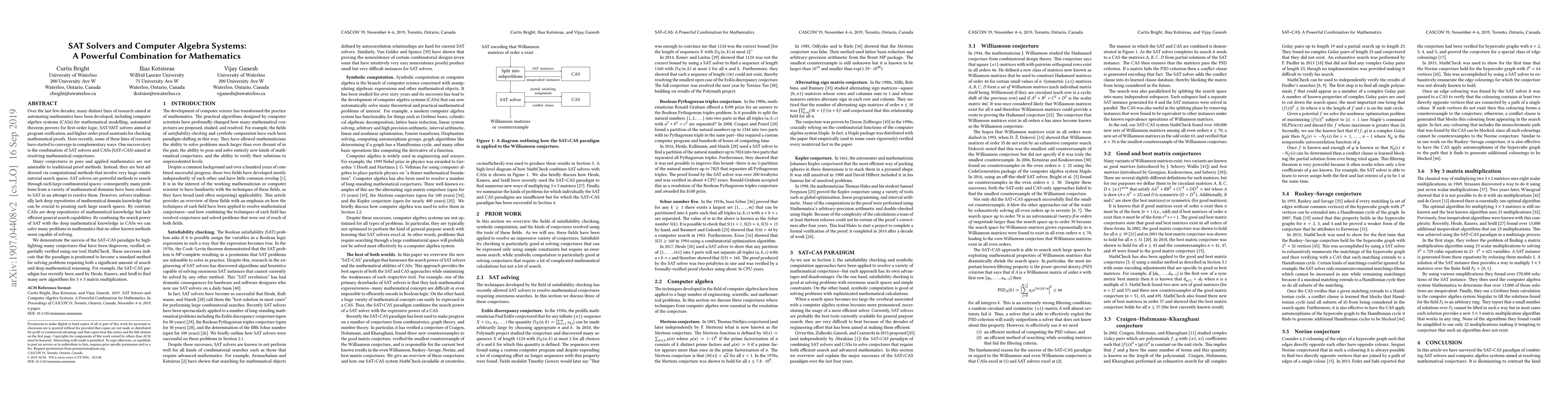 The integration of SAT solvers with computer algebra systems (SAT+CAS) has proven effective in resolving mathematical conjectures by leveraging the search power of SAT solvers and the deep mathematical knowledge of CASs, as demonstrated by the tool MathCheck in solving various conjectures and discovering new algorithms. This approach is poised to become a standard method for tackling problems requiring extensive search and advanced mathematical reasoning.