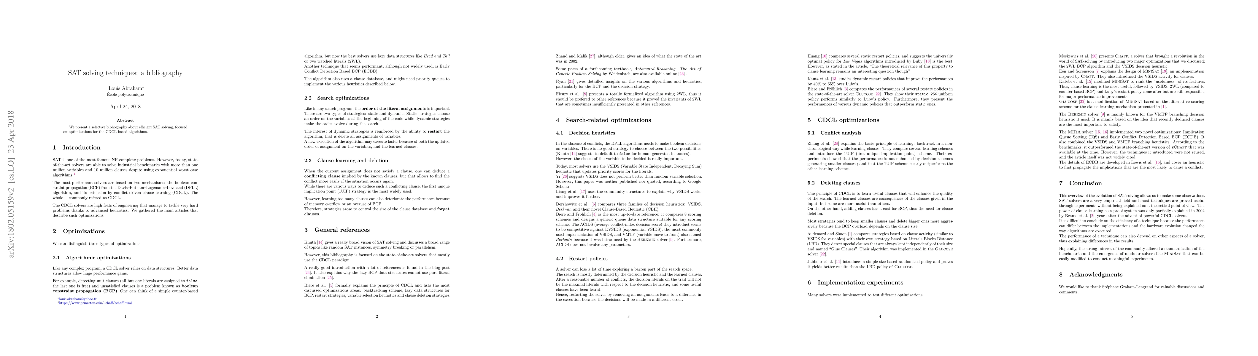 Summary: This paper provides a selective bibliography on efficient SAT solving techniques, specifically focusing on optimizations for Conflict-Driven Clause Learning (CDCL)-based algorithms. It serves as a valuable resource for researchers interested in advancements in SAT solvers.