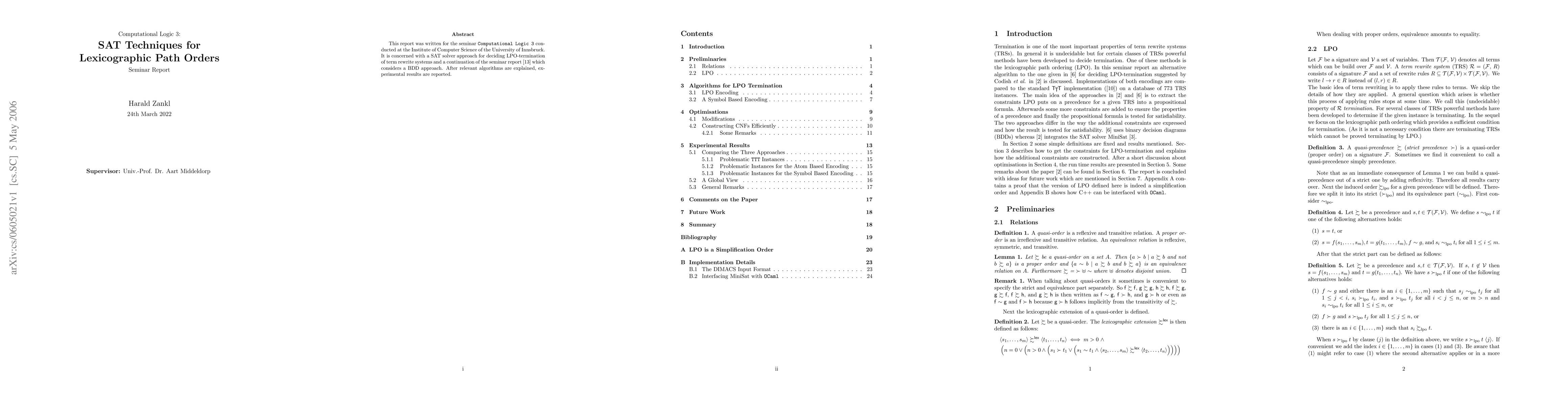This paper explores using SAT (satisfiability) techniques to determine LPO (lexicographic path order) termination of term rewrite systems. It details relevant algorithms and shares experimental results, implying a new method for verifying termination in rewrite systems.