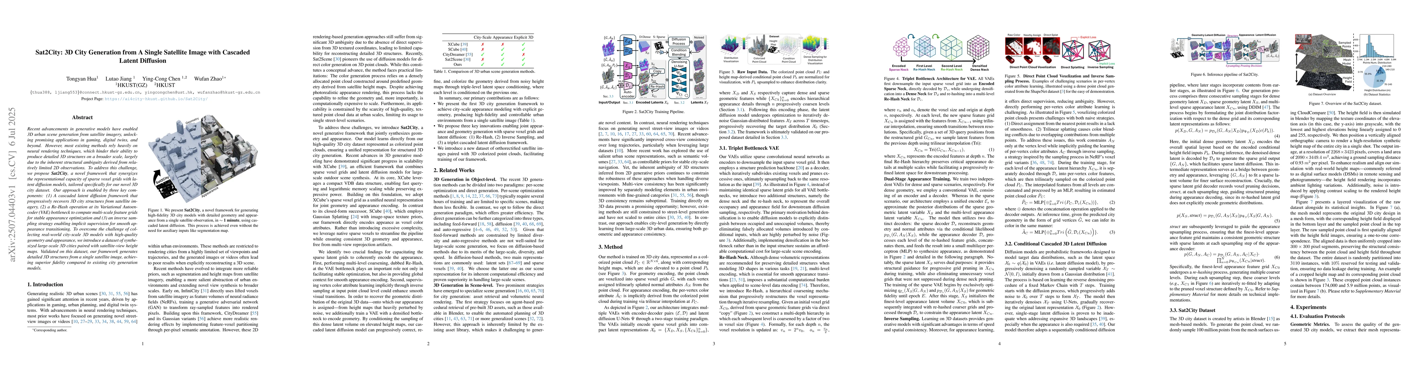 Recent advancements in generative models have enabled 3D urban scene generation from satellite imagery, unlocking promising applications in gaming, digital twins, and beyond. However, most existing methods rely heavily on neural rendering techniques, which hinder their ability to produce detailed 3D structures on a broader scale, largely due to the inherent structural ambiguity derived from relatively limited 2D observations. To address this challenge, we propose Sat2City, a novel framework that synergizes the representational capacity of sparse voxel grids with latent diffusion models, tailored specifically for our novel 3D city dataset. Our approach is enabled by three key components: (1) A cascaded latent diffusion framework that progressively recovers 3D city structures from satellite imagery, (2) a Re-Hash operation at its Variational Autoencoder (VAE) bottleneck to compute multi-scale feature grids for stable appearance optimization and (3) an inverse sampling strategy enabling implicit supervision for smooth appearance transitioning.To overcome the challenge of collecting real-world city-scale 3D models with high-quality geometry and appearance, we introduce a dataset of synthesized large-scale 3D cities paired with satellite-view height maps. Validated on this dataset, our framework generates detailed 3D structures from a single satellite image, achieving superior fidelity compared to existing city generation models.