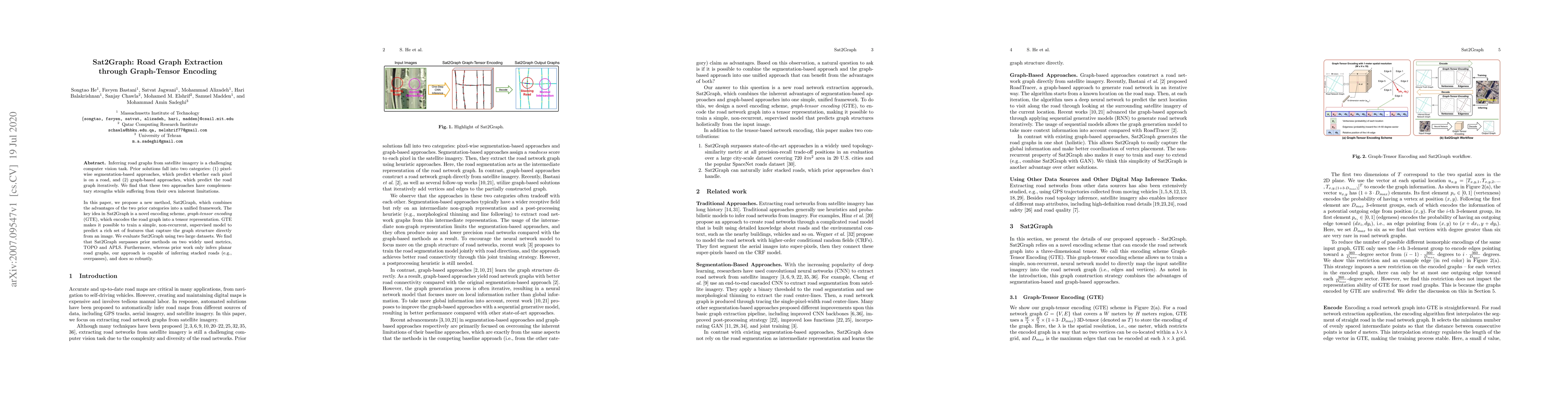 The research paper introduces Sat2Graph, a novel method for inferring road graphs from satellite imagery. It combines pixel-wise segmentation and graph-based approaches using a new encoding scheme, graph-tensor encoding (GTE). This allows for a simple, supervised model to predict rich graph features directly from images. Sat2Graph outperforms previous methods on two large datasets, accurately inferring both planar and stacked road structures.