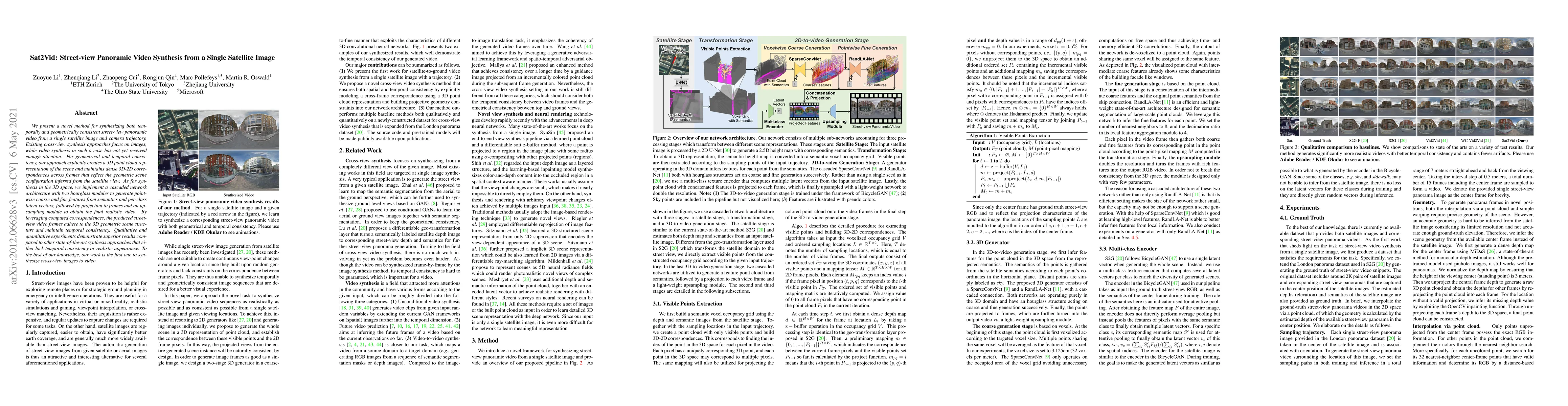 This paper introduces a novel method for generating temporally and geometrically consistent street-view panoramic videos from a single satellite image and camera trajectory, utilizing a 3D point cloud and dense 3D-2D correspondences for consistency. The approach employs a cascaded network architecture to synthesize realistic and coherent video frames.