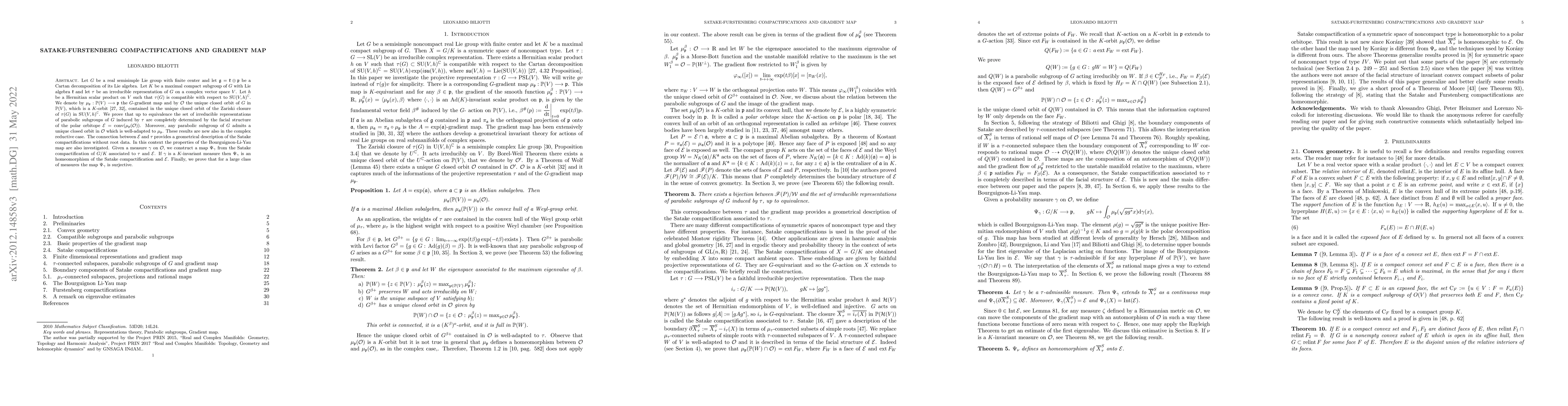 Let $G$ be a real semisimple Lie group with finite center and let $\mathfrak g=\mathfrak k \oplus \mathfrak p$ be a Cartan decomposition of its Lie algebra. Let $K$ be a maximal compact subgroup of $G$ with Lie algebra $\mathfrak k$ and let $\tau$ be an irreducible representation of $G$ on a complex vector space $V$. Let $h$ be a Hermitian scalar product on $V$ such that $\tau(G)$ is compatible with respect to $\mathrm{U}(V,h)^{\mathbb C}$. We denote by $\mu_{\mathfrak p}:\mathbb P(V) \longrightarrow \mathfrak p$ the $G$-gradient map and by $\mathcal O$ the unique closed orbit of $G$ in $\mathbb P(V)$, which is a $K$-orbit, contained in the unique closed orbit of the Zariski closure of $\tau(G)$ in $\mathrm{U}(V,h)^{\mathbb C}$. We prove that up to equivalence the set of irreducible representations of parabolic subgroups of $G$ induced by $\tau$ are completely determined by the facial structure of the polar orbitope $\mathcal E=\mathrm{conv}(\mu_{\mathfrak p} (\mathcal O))$. Moreover, any parabolic subgroup of $G$ admits a unique closed orbit which is well-adapted to $\mathcal O$ and $\mu_{\mathfrak p}$ respectively. These results are new also in the complex reductive case. The connection between $\mathcal E$ and $\tau$ provides a geometrical description of the Satake compactifications without root data. In this context the properties of the Bourguignon-Li-Yau map are also investigated. Given a measure $\gamma$ on $\mathcal O$, we construct a map $\Psi_\gamma$ from the Satake compactification of $G/K$ associated to $\tau$ and $\mathcal E$. If $\gamma$ is a $K$-invariant measure then $\Psi_\gamma$ is an homeomorphism of the Satake compactification and $\mathcal E$. Finally, we prove that for a large class of measures the map $\Psi_\gamma$ is surjective.