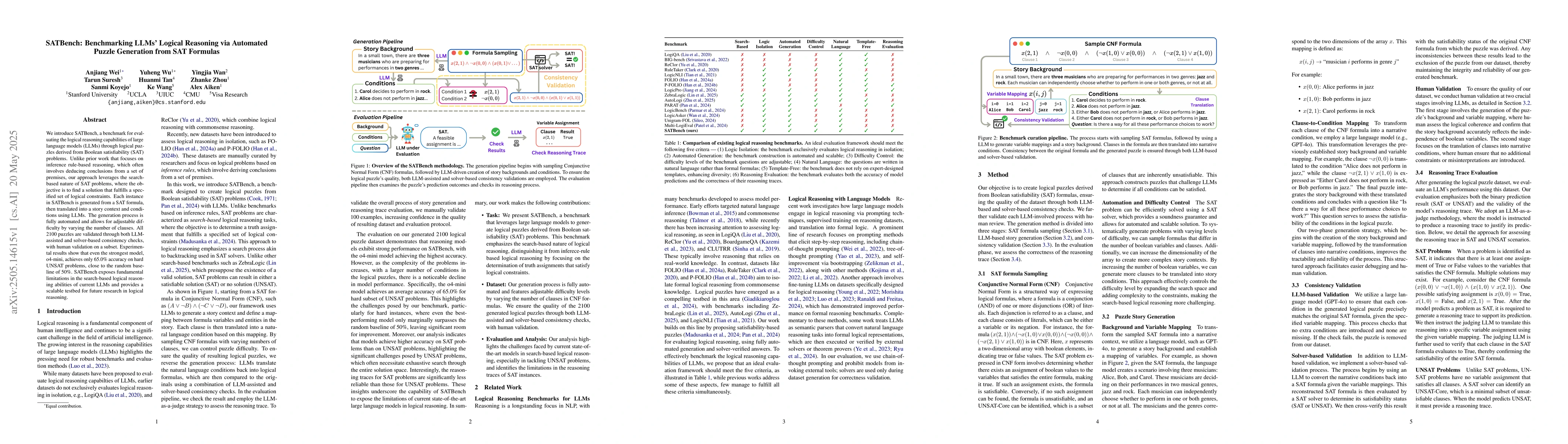 The research introduces SATBench, a benchmark for evaluating LLMs' logical reasoning abilities using puzzles derived from SAT formulas. Puzzles are generated by translating SAT instances into story contexts with conditions via LLMs, offering adjustable difficulty through clause variation.