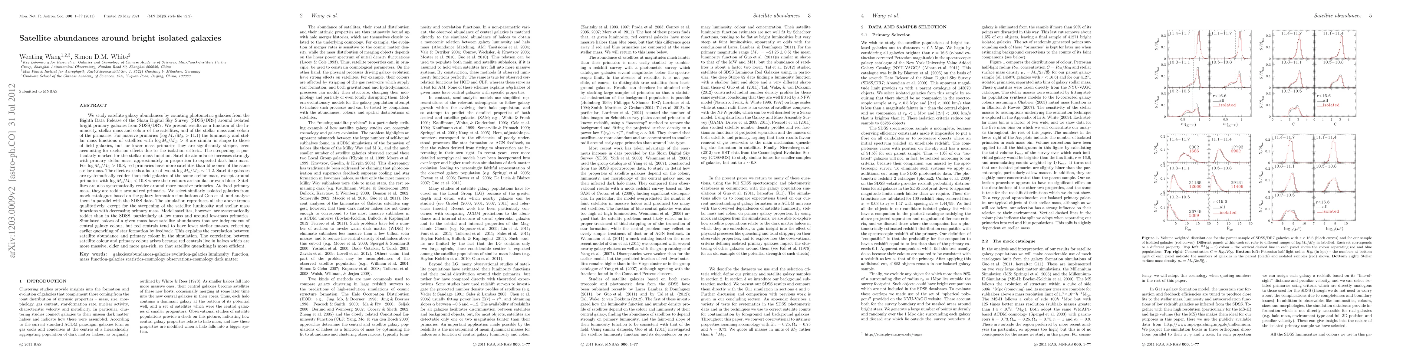 This paper examines satellite galaxy abundances around isolated bright galaxies in the SDSS, finding that satellite luminosity and stellar mass functions are steeper for lower mass primaries. Satellite abundance correlates strongly with primary stellar mass, with red primaries hosting more satellites than blue ones. Simulations by Guo et al. (2011) qualitatively reproduce these trends but show discrepancies in satellite color and quenching processes.