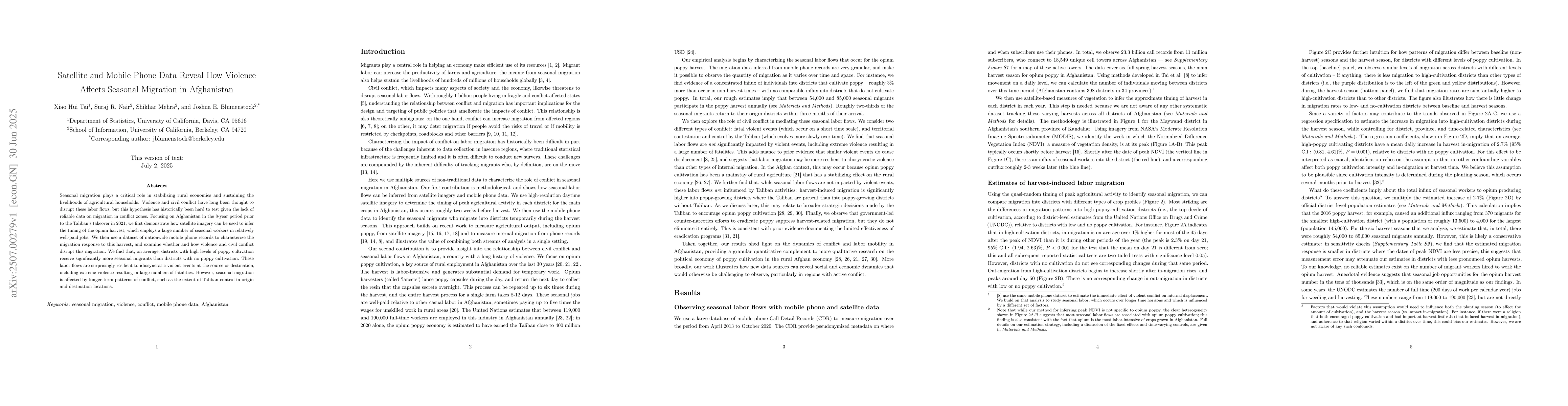 Seasonal migration plays a critical role in stabilizing rural economies and sustaining the livelihoods of agricultural households. Violence and civil conflict have long been thought to disrupt these labor flows, but this hypothesis has historically been hard to test given the lack of reliable data on migration in conflict zones. Focusing on Afghanistan in the 8-year period prior to the Taliban's takeover in 2021, we first demonstrate how satellite imagery can be used to infer the timing of the opium harvest, which employs a large number of seasonal workers in relatively well-paid jobs. We then use a dataset of nationwide mobile phone records to characterize the migration response to this harvest, and examine whether and how violence and civil conflict disrupt this migration. We find that, on average, districts with high levels of poppy cultivation receive significantly more seasonal migrants than districts with no poppy cultivation. These labor flows are surprisingly resilient to idiosyncratic violent events at the source or destination, including extreme violence resulting in large numbers of fatalities. However, seasonal migration is affected by longer-term patterns of conflict, such as the extent of Taliban control in origin and destination locations.