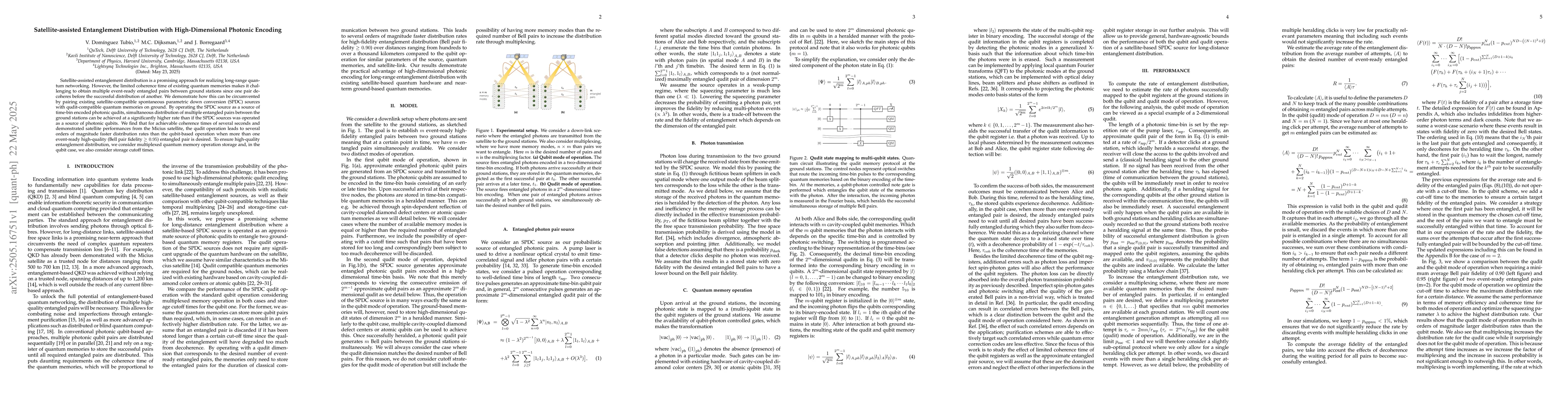 The research utilizes satellite-assisted entanglement distribution, combining SPDC sources with qudit-compatible quantum memories on the ground, to overcome coherence time limitations of quantum memories.