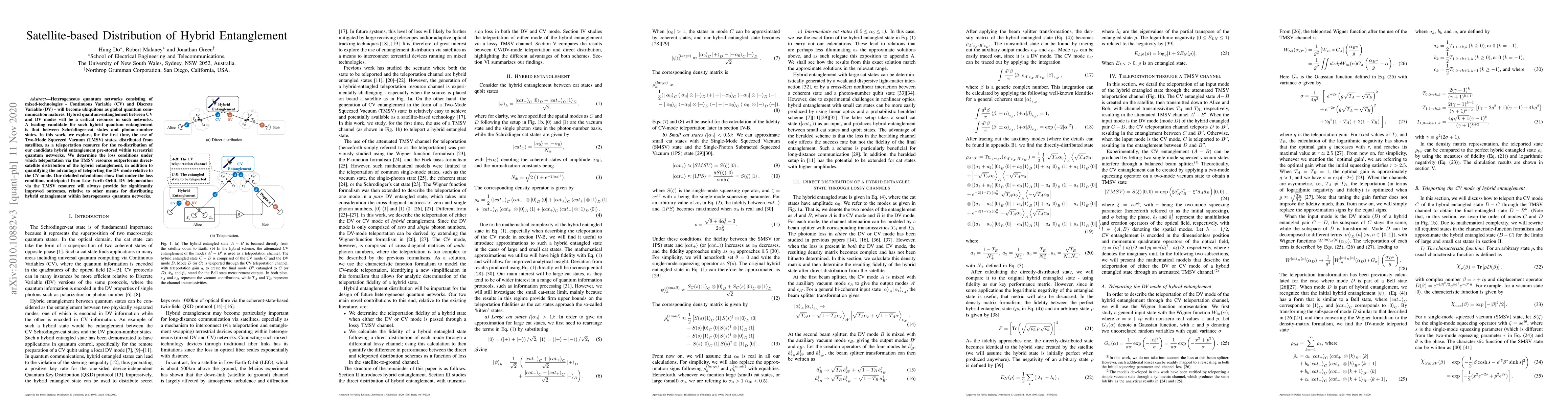 Heterogeneous quantum networks consisting of mixed-technologies - Continuous Variable (CV) and Discrete Variable (DV) - will become ubiquitous as global quantum communication matures. Hybrid quantum-entanglement between CV and DV modes will be a critical resource in such networks. A leading candidate for such hybrid quantum entanglement is that between Schr\"odinger-cat states and photon-number states. In this work, we explore the use of Two-Mode Squeezed Vacuum (TMSV) states, distributed from satellites, as a teleportation resource for the re-distribution of our candidate hybrid entanglement pre-stored within terrestrial quantum networks. We determine the loss conditions under which teleportation via the TMSV resource outperforms direct-satellite distribution of the hybrid entanglement, in addition to quantifying the advantage of teleporting the DV mode relative to the CV mode. Our detailed calculations show that under the loss conditions anticipated from Low-Earth-Orbit, DV teleportation via the TMSV resource will always provide for significantly improved outcomes, relative to other means for distributing hybrid entanglement within heterogeneous quantum networks.