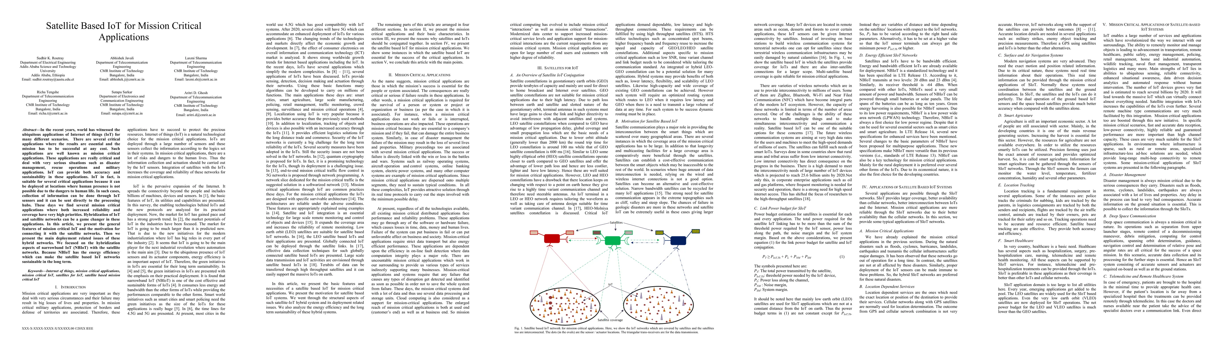 In the recent years, world has witnessed the ubiquitous applications of Internet of things (IoT) for many different scenarios. There are several critical applications where the results are essential and the mission has to be successful at any cost. Such applications are well known as mission critical applications. These applications are really critical and deal with very serious situations such as disaster management, rescue operations and military applications. IoT can provide both accuracy and sustainability in these applications. IoT in fact, is suitable for several critical applications because it can be deployed at locations where human presence is not possible due to the dangers to human life. In such cases, collection of information can be done through IoT sensors and it can be sent directly to the processing hubs. These days we find several mission critical applications where both increased reliability and coverage have very high priorities. Hybridization of IoT and satellite networks can be a game changer in these applications. In this article, we present the general features of mission critical IoT and the motivation for connecting it with the satellite networks. Then we present the main deployment related issues of these hybrid networks. We focused on the hybridization aspects of narrowband IoT (NBIoT) with the satellite networks. Because NBIoT has the energy efficiency which can make the satellite based IoT networks sustainable in the long term.
