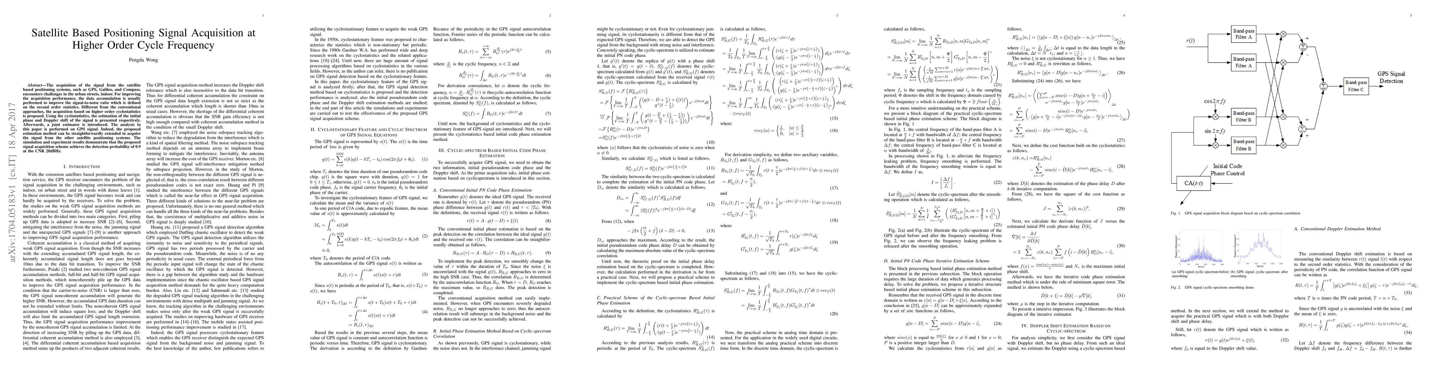 The acquisition of the signal from the satellite based positioning systems, such as GPS, Galileo, and Compass, encounters challenges in the urban streets, indoor. For improving the acquisition performance, the data accumulation is usually performed to improve the signal-to-noise ratio which is defined on the second order statistics. Different from the conventional approaches, the acquisition based on higher order cyclostatistics is proposed. Using the cyclostatistics, the estimation of the initial phase and Doppler shift of the signal is presented respectively. Afterwards, a joint estimator is introduced. The analysis in this paper is performed on GPS signal. Indeed, the proposed estimation method can be straightforwardly extended to acquire the signal from the other satellite positioning systems. The simulation and experiment results demonstrate that the proposed signal acquisition scheme achieves the detection probability of 0.9 at the CNR 28dBHz.