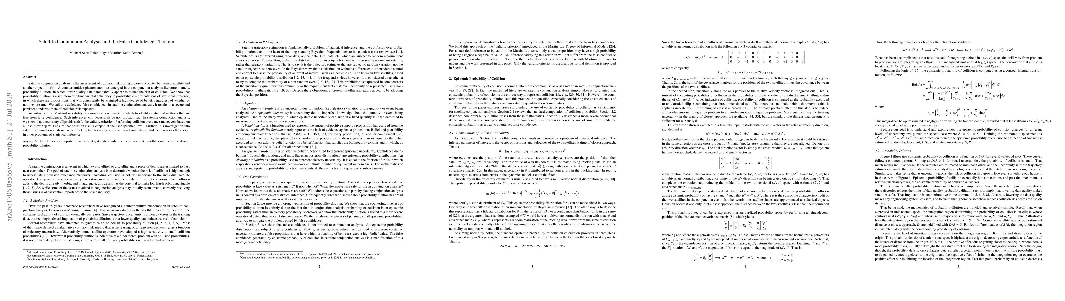 This paper investigates satellite conjunction analysis, identifying "probability dilution" as a paradoxical phenomenon where lower quality data reduce collision risk estimates. It reveals this as a manifestation of "false confidence," a fundamental statistical inference flaw leading to underestimated collision risks. The authors propose the Martin--Liu validity criterion to avoid false confidence, demonstrating that uncertainty ellipsoids meet this criterion and can cap collision risk at specified levels.
