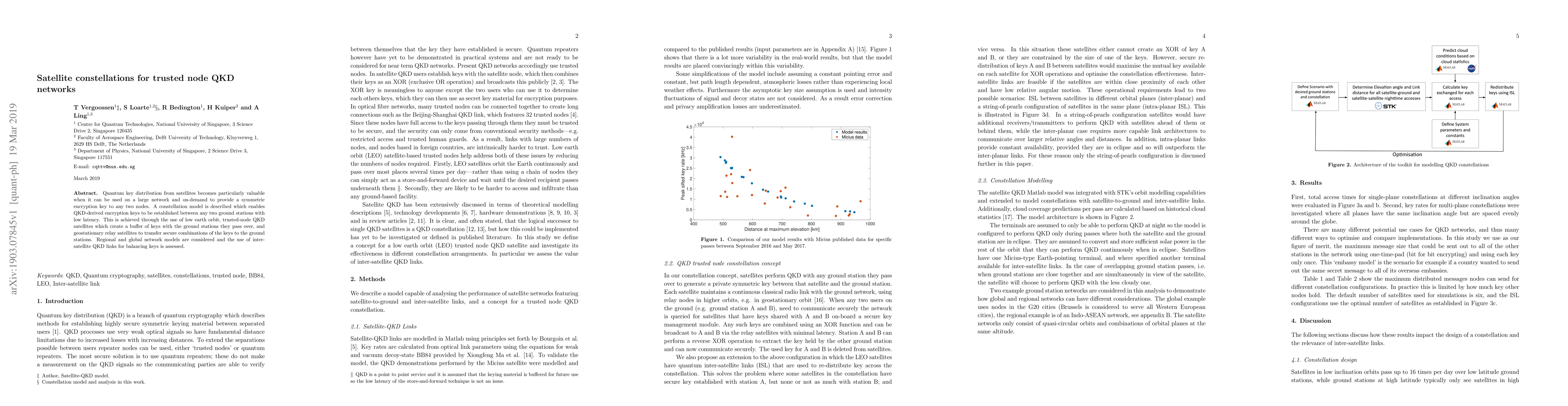 Quantum key distribution from satellites becomes particularly valuable when it can be used on a large network and on-demand to provide a symmetric encryption key to any two nodes. A constellation model is described which enables QKD-derived encryption keys to be established between any two ground stations with low latency. This is achieved through the use of low earth orbit, trusted-node QKD satellites which create a buffer of keys with the ground stations they pass over, and geostationary relay satellites to transfer secure combinations of the keys to the ground stations. Regional and global network models are considered and the use of inter-satellite QKD links for balancing keys is assessed.