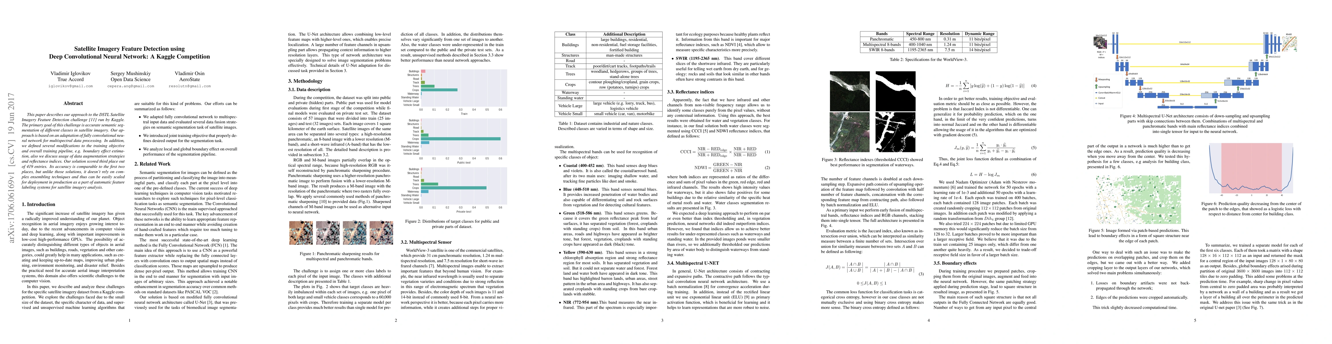 This paper describes our approach to the DSTL Satellite Imagery Feature Detection challenge run by Kaggle. The primary goal of this challenge is accurate semantic segmentation of different classes in satellite imagery. Our approach is based on an adaptation of fully convolutional neural network for multispectral data processing. In addition, we defined several modifications to the training objective and overall training pipeline, e.g. boundary effect estimation, also we discuss usage of data augmentation strategies and reflectance indices. Our solution scored third place out of 419 entries. Its accuracy is comparable to the first two places, but unlike those solutions, it doesn't rely on complex ensembling techniques and thus can be easily scaled for deployment in production as a part of automatic feature labeling systems for satellite imagery analysis.