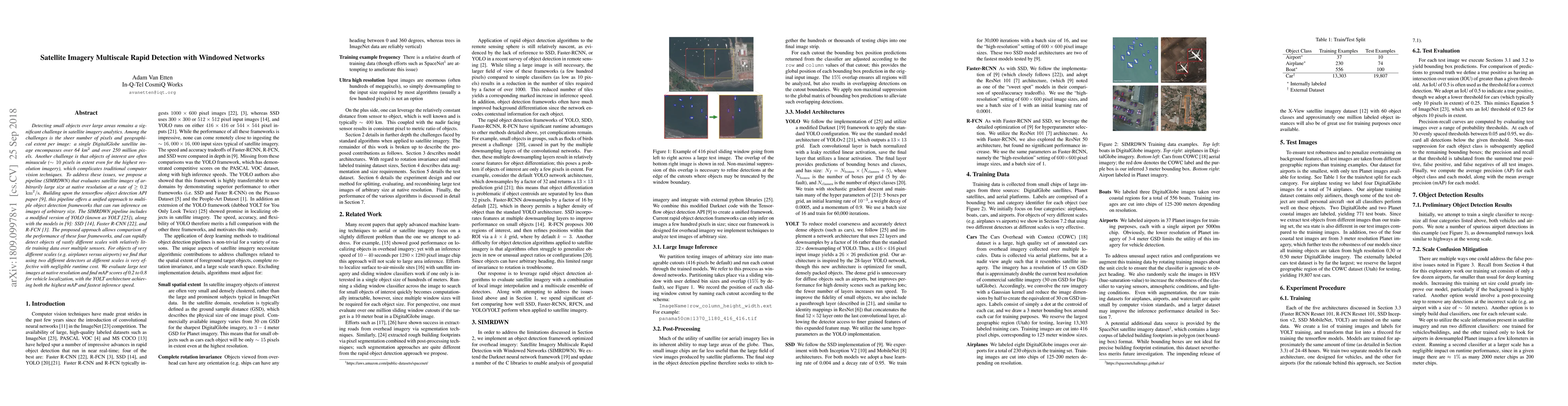 This paper proposes SIMRDWN, a pipeline for multiscale rapid detection in satellite imagery using windowed networks, including modified YOLO (YOLT) and TensorFlow object detection models. The approach efficiently detects objects of varying scales at high speeds, achieving mAP scores from 0.2 to 0.8 for vehicle localization, with YOLT showing the best performance.