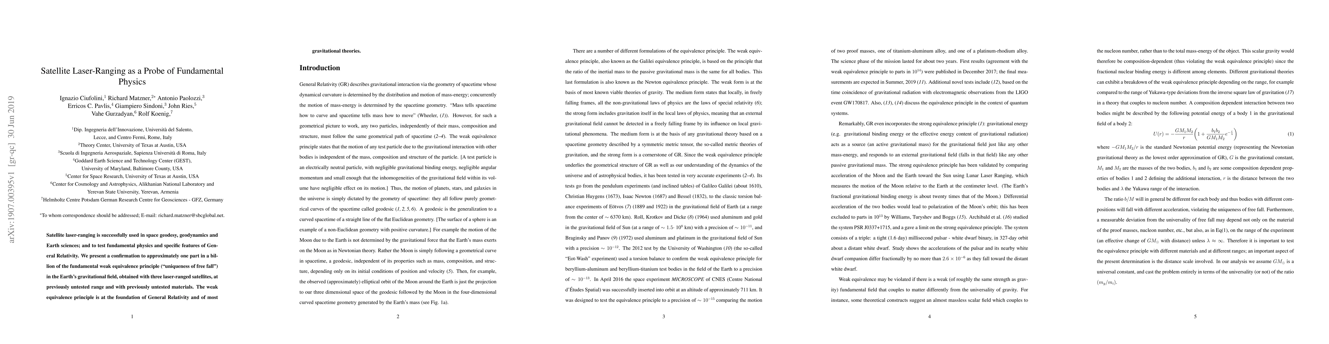 This paper confirms the weak equivalence principle to a precision of one part in a billion using satellite laser-ranging, involving three satellites and previously untested materials, thereby testing fundamental physics and General Relativity in the Earth's gravitational field.