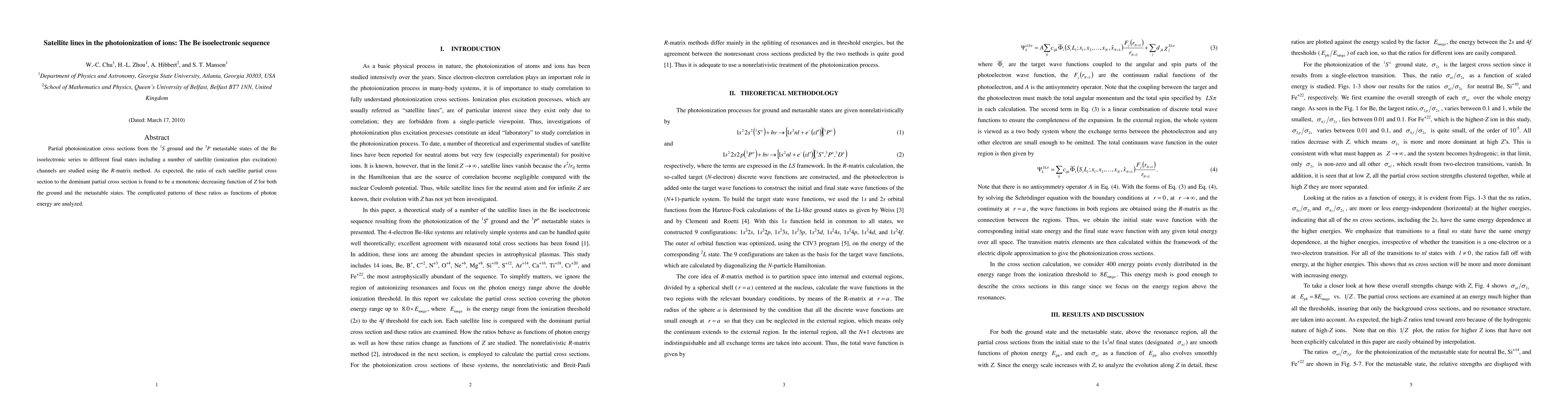 This paper investigates the partial photoionization cross sections of the Be isoelectronic sequence using the R-matrix method, focusing on satellite lines from ground and metastable states. The study finds that satellite-to-dominant cross section ratios decrease monotonically with atomic number Z and analyzes complex patterns in these ratios across different photon energies.