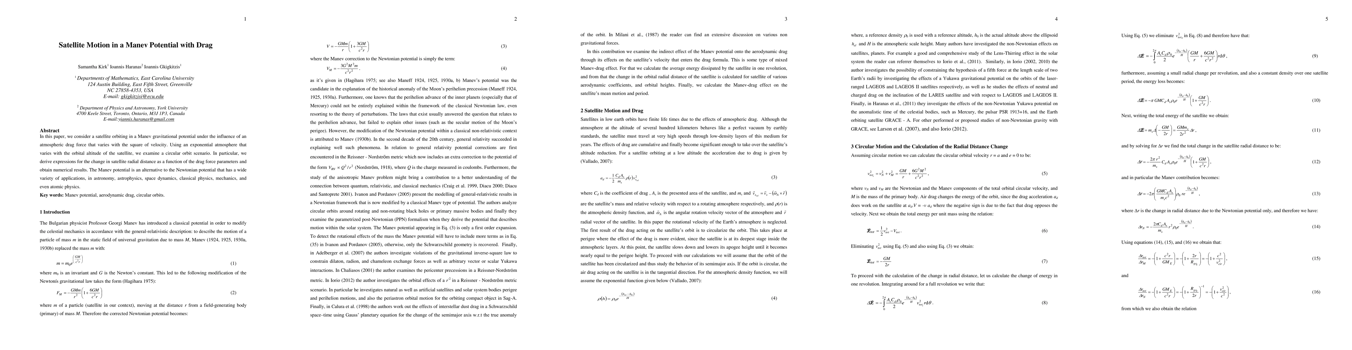 This paper investigates satellite motion in a Manev potential with atmospheric drag, deriving expressions for radial distance changes due to drag force parameters in a circular orbit scenario. Numerical results are obtained to analyze the effects of varying drag forces on satellite dynamics.