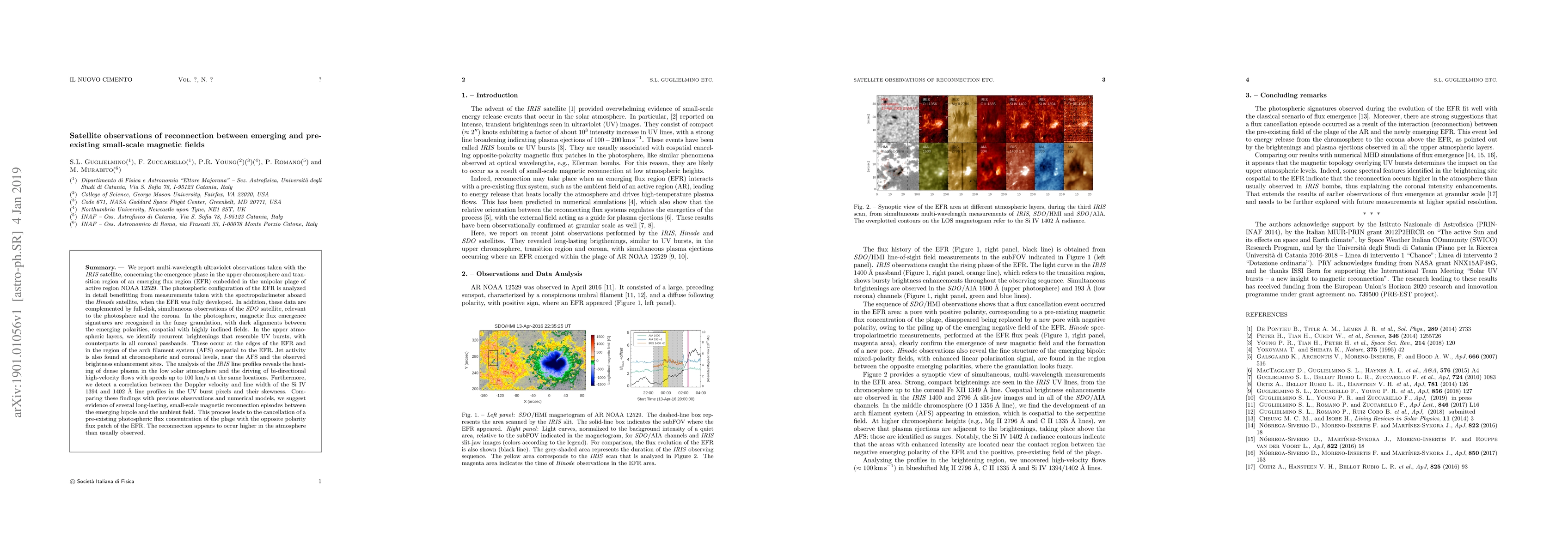 We report multi-wavelength ultraviolet observations taken with the IRIS satellite, concerning the emergence phase in the upper chromosphere and transition region of an emerging flux region (EFR) embedded in the unipolar plage of active region NOAA 12529. The photospheric configuration of the EFR is analyzed in detail benefitting from measurements taken with the spectropolarimeter aboard the Hinode satellite, when the EFR was fully developed. In addition, these data are complemented by full-disk, simultaneous observations of the SDO satellite, relevant to the photosphere and the corona. In the photosphere, magnetic flux emergence signatures are recognized in the fuzzy granulation, with dark alignments between the emerging polarities, cospatial with highly inclined fields. In the upper atmospheric layers, we identify recurrent brightenings that resemble UV bursts, with counterparts in all coronal passbands. These occur at the edges of the EFR and in the region of the arch filament system (AFS) cospatial to the EFR. Jet activity is also found at chromospheric and coronal levels, near the AFS and the observed brightness enhancement sites. The analysis of the IRIS line profiles reveals the heating of dense plasma in the low solar atmosphere and the driving of bi-directional high-velocity flows with speeds up to 100 km/s at the same locations. Furthermore, we detect a correlation between the Doppler velocity and line width of the Si IV 1394 and 1402 \AA{} line profiles in the UV burst pixels and their skewness. Comparing these findings with previous observations and numerical models, we suggest evidence of several long-lasting, small-scale magnetic reconnection episodes between the emerging bipole and the ambient field. This process leads to the cancellation of a pre-existing photospheric flux concentration of the plage with the opposite polarity flux patch of the EFR. [...]