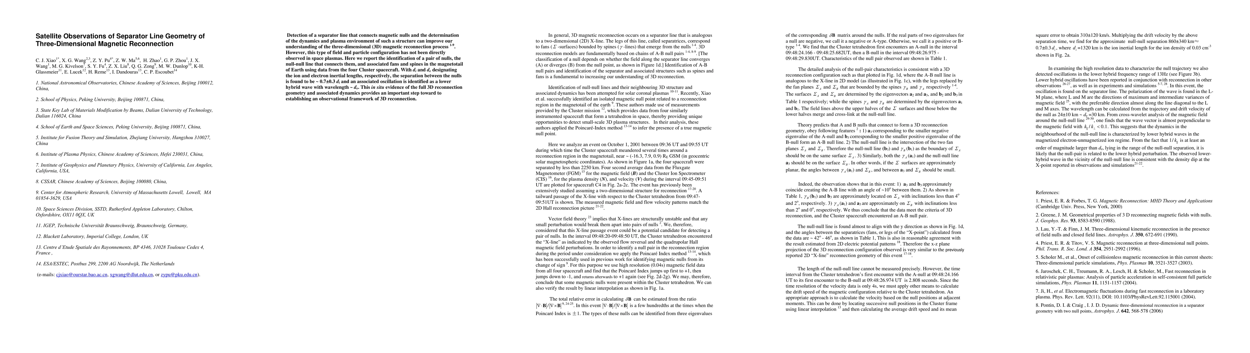 This research identifies, for the first time, a separator line connecting magnetic nulls in Earth's magnetotail using Cluster spacecraft data. The separation is ~0.7 ion inertial lengths, with an associated lower hybrid wave observed.