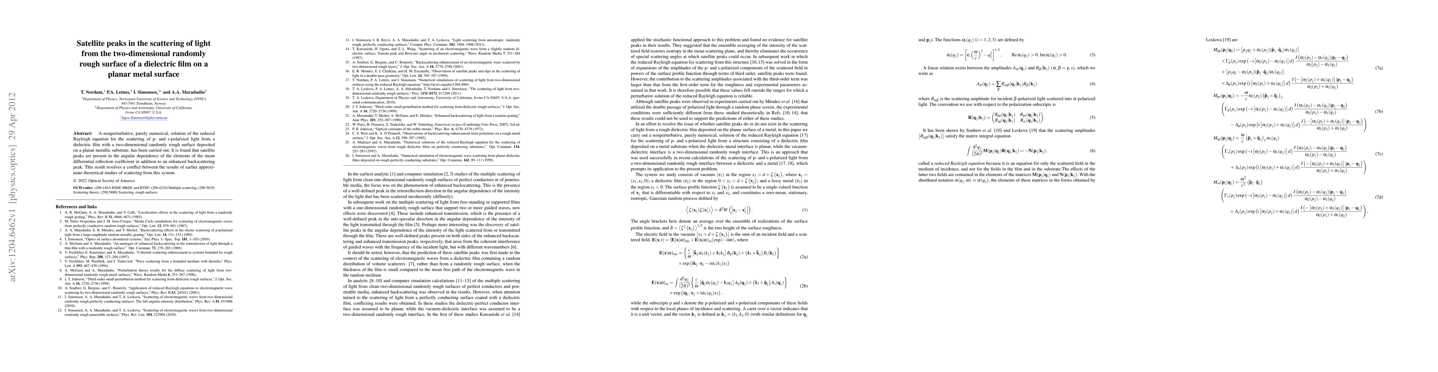 This paper presents a numerical solution to the scattering of light from a dielectric film with a randomly rough surface on a metal substrate, revealing satellite peaks in the scattering pattern alongside an enhanced backscattering peak, resolving discrepancies in previous theoretical studies.