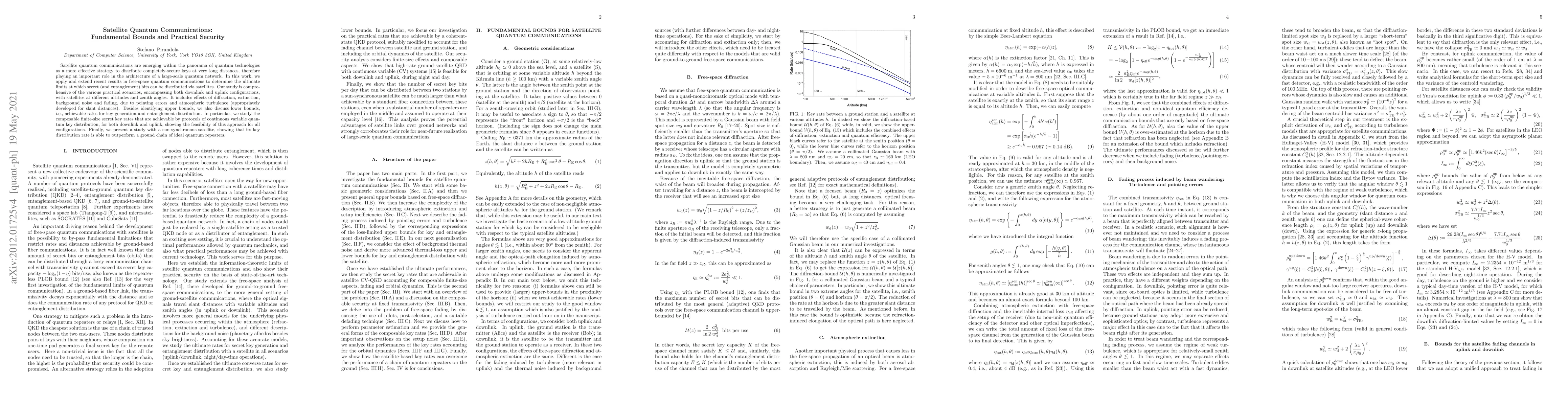 This paper explores the fundamental limits and practical security of satellite quantum communications, determining the maximum rates for secret and entanglement bit distribution. It evaluates various scenarios, including different satellite altitudes and angles, and considers factors like diffraction, noise, and atmospheric turbulence, ultimately demonstrating the feasibility of continuous variable quantum key distribution protocols.