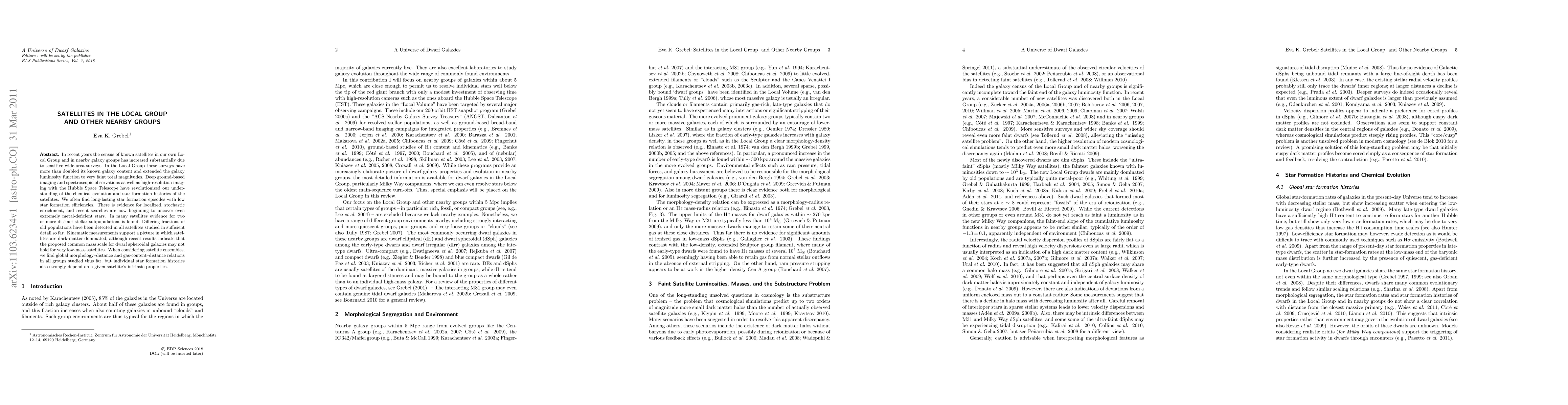 This paper reviews the significant increase in the census of satellite galaxies in the Local Group and nearby galaxy groups, highlighting advancements in observational techniques that have enhanced our understanding of their chemical evolution, star formation histories, and dark matter dominance. It also discusses the presence of distinct stellar subpopulations and the complex interplay between global group relations and individual satellite properties.
