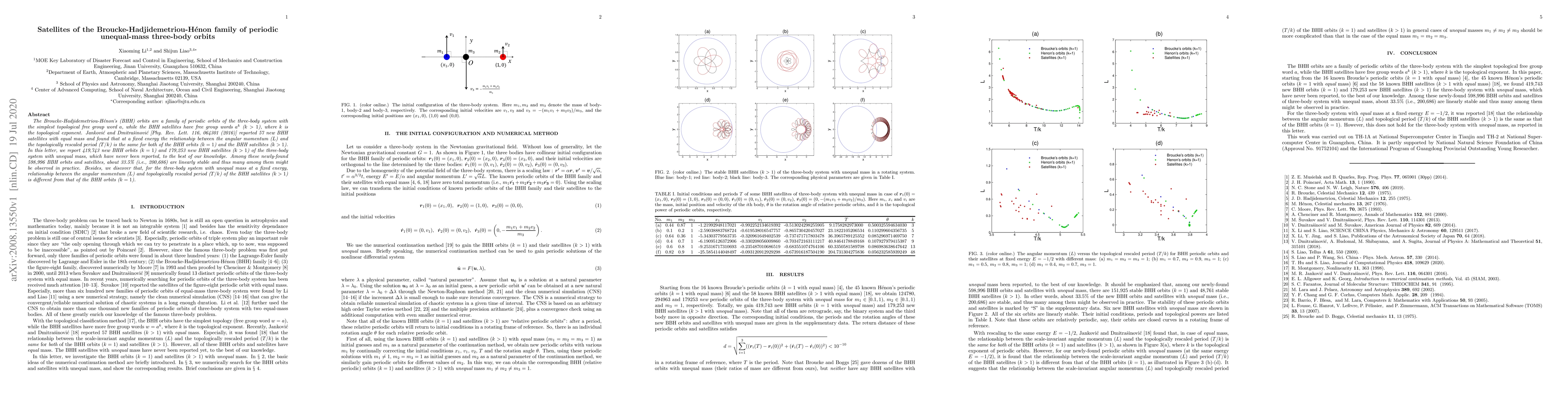 The Broucke-Hadjidemetriou-H\'{e}non's (BHH) orbits are a family of periodic orbits of the three-body system with the simplest topological free group word $a$, while the BHH satellites have free group words $a^k$ ($k>1$), where $k$ is the topological exponent. Jankovi\'{c} and Dmitra\v{s}inovi\'{c} [Phy. Rev. Lett. 116, 064301 (2016)] reported 57 new BHH satellites with equal mass and found that at a fixed energy the relationship between the angular momentum ($L$) and the topologically rescaled period ($T/k$) is the same for both of the BHH orbits ($k=1$) and the BHH satellites ($k>1$). In this letter, we report 419,743 new BHH orbits ($k=1$) and 179,253 new BHH satellites ($k>1$) of the three-body system with unequal mass, which have never been reported, to the best of our knowledge. Among these newly-found 598,996 BBH orbits and satellites, about 33.5 % (i.e., 200,686) are linearly stable and thus many among them might be observed in practice. Besides, we discover that, for the three-body system with unequal mass at a fixed energy, relationship between the angular momentum ($L$) and topologically rescaled period ($T/k$) of the BHH satellites ($k>1$) is different from that of the BHH orbits ($k=1$).