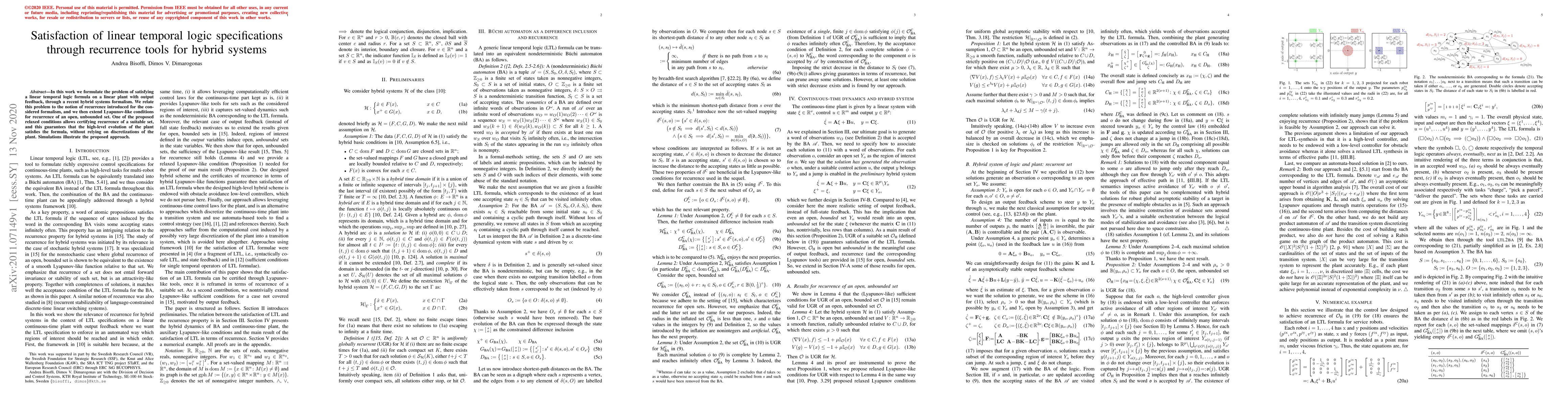 In this work we formulate the problem of satisfying a linear temporal logic formula on a linear plant with output feedback, through a recent hybrid systems formalism. We relate this problem to the notion of recurrence introduced for the considered formalism, and we then extend Lyapunov-like conditions for recurrence of an open, unbounded set. One of the proposed relaxed conditions allows certifying recurrence of a suitable set, and this guarantees that the high-level evolution of the plant satisfies the formula, without relying on discretizations of the plant. Simulations illustrate the proposed approach.